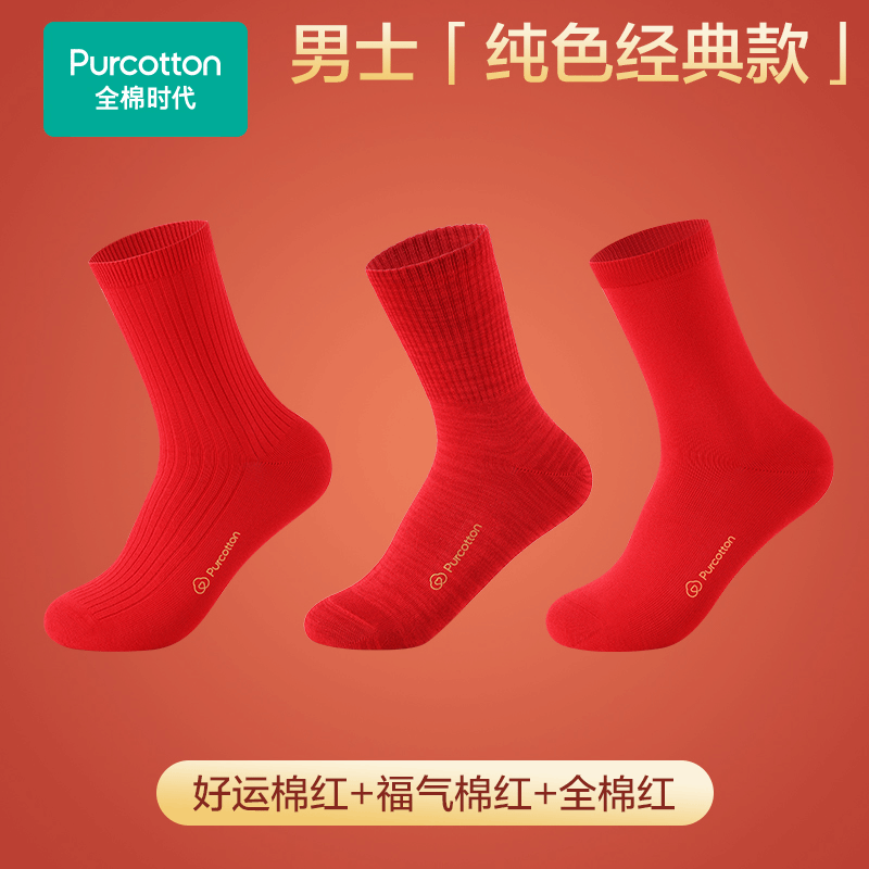 全棉时代男士全棉抗菌长筒袜 26cm-28cm 發财棉红+财运棉红+好运棉红