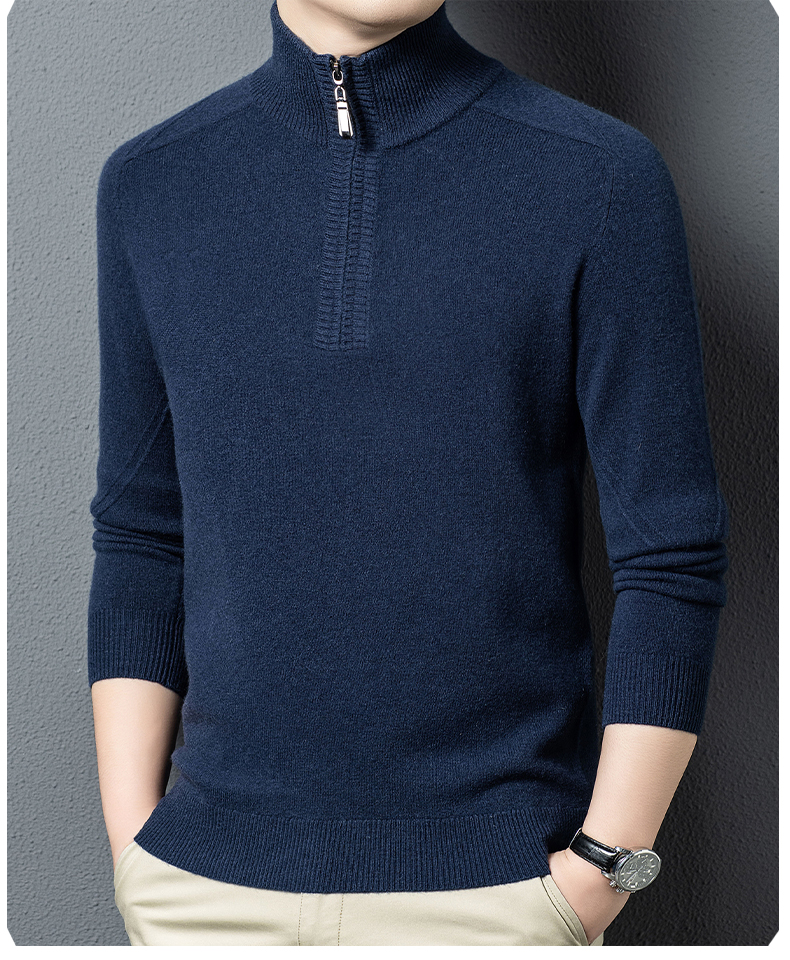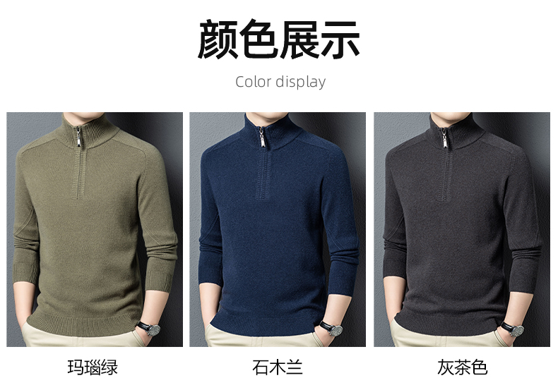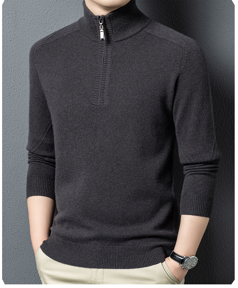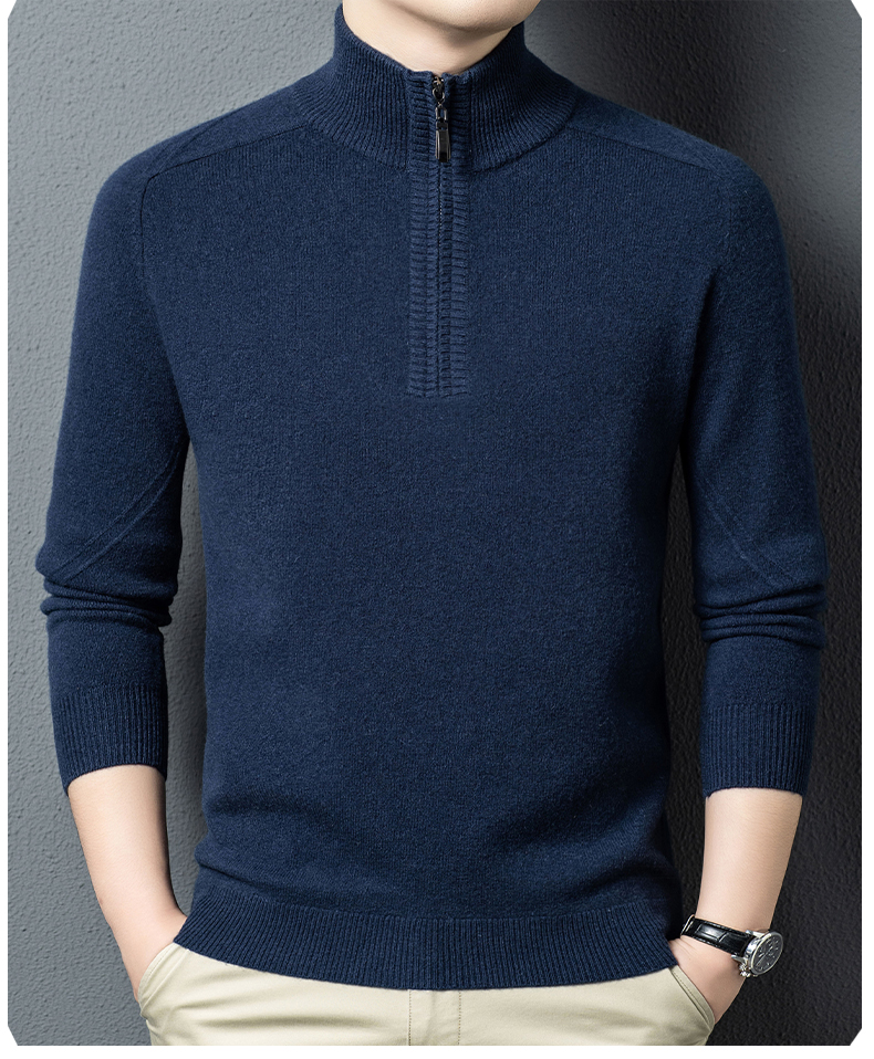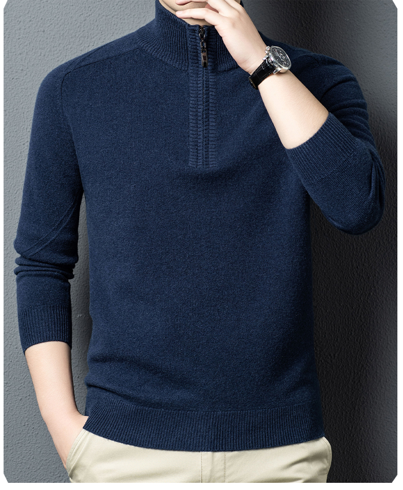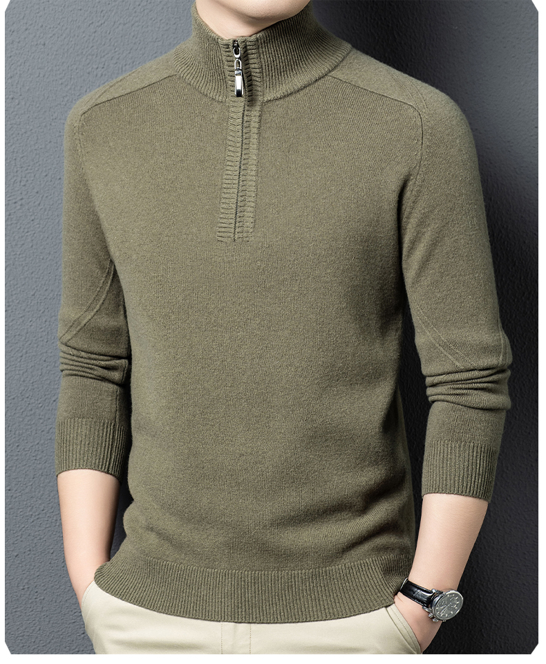 100%纯羊毛男士半高拉链领秋冬季新款纯色商务休闲套头针织衫