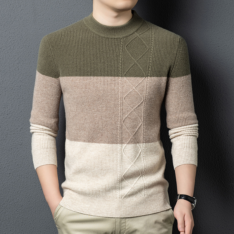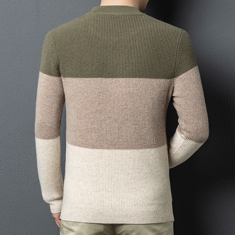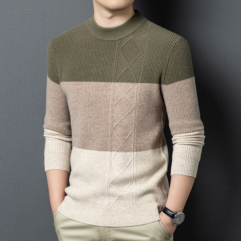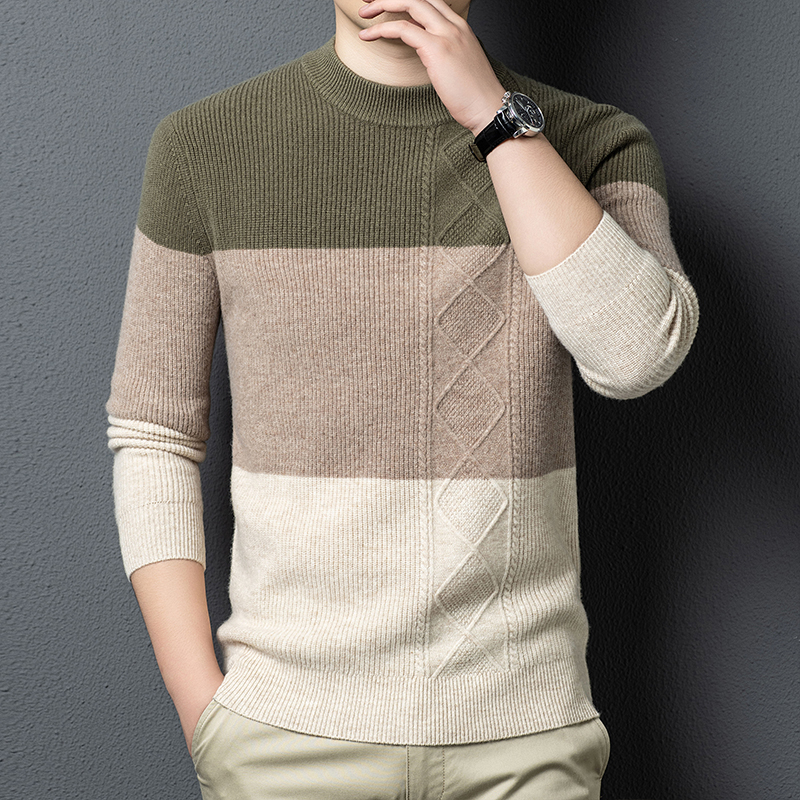 撞色拼接100%纯羊毛男士秋冬季休闲加厚毛衣保暖针织衫