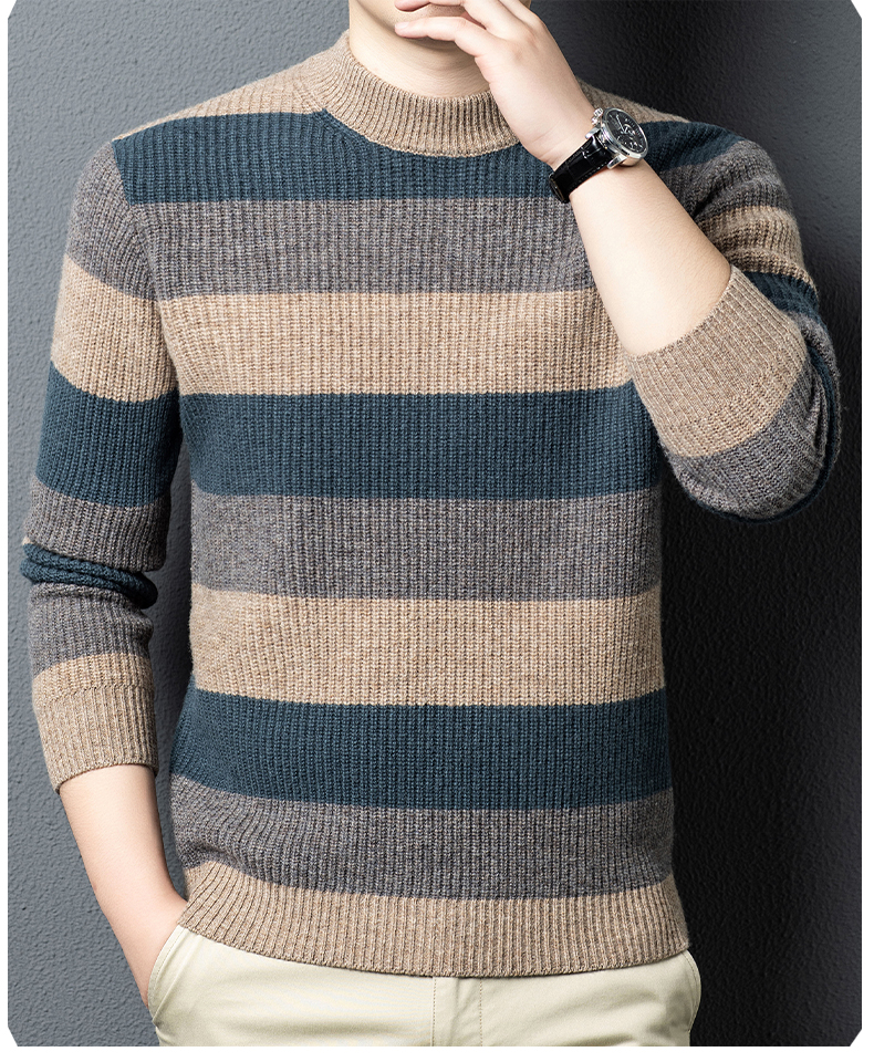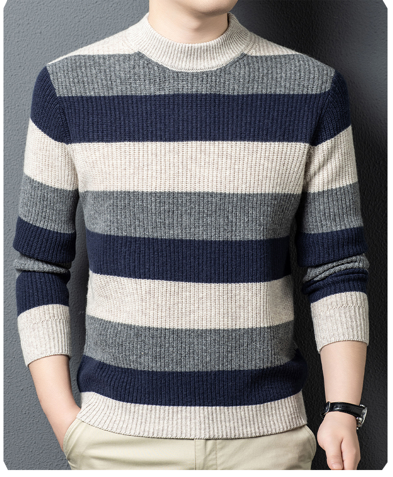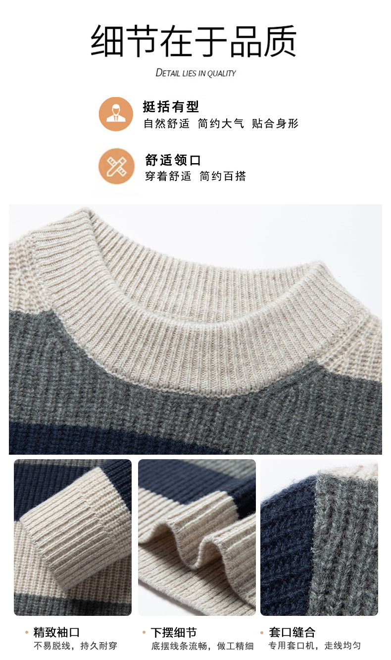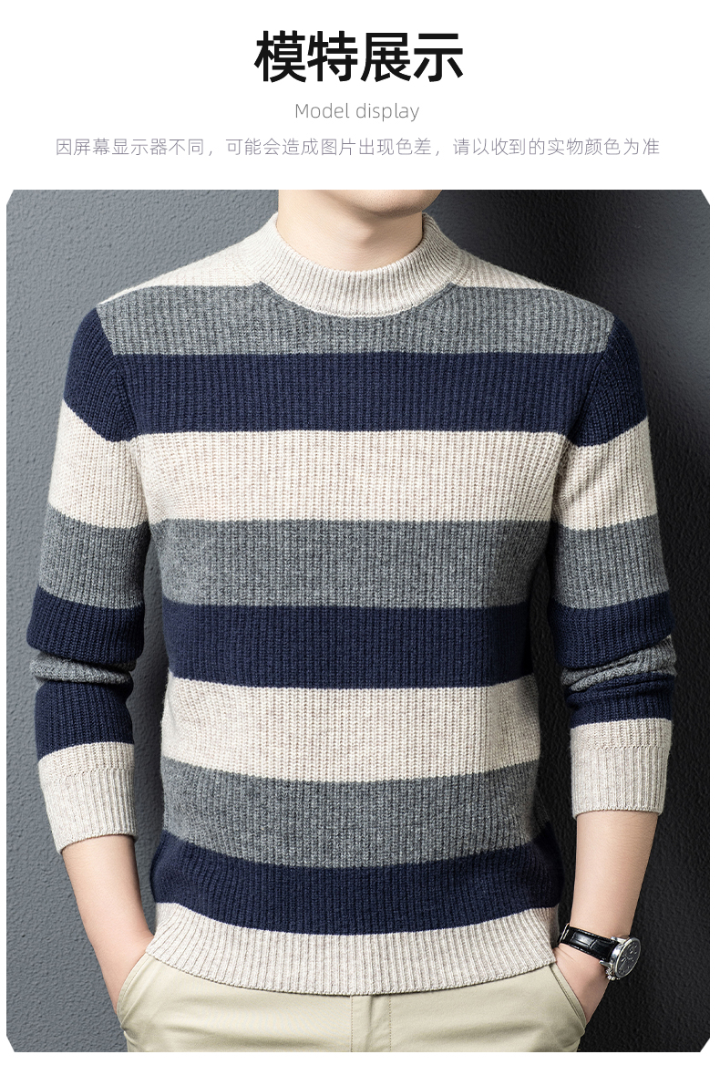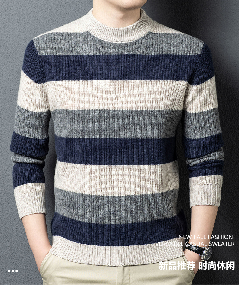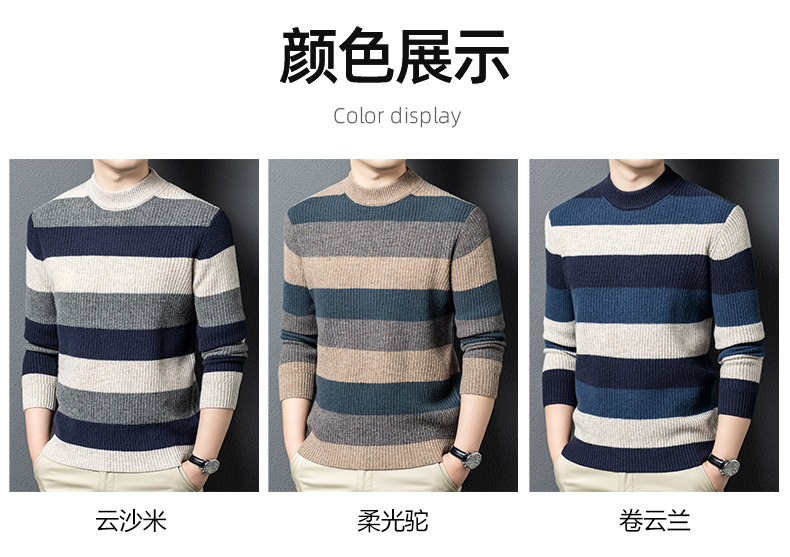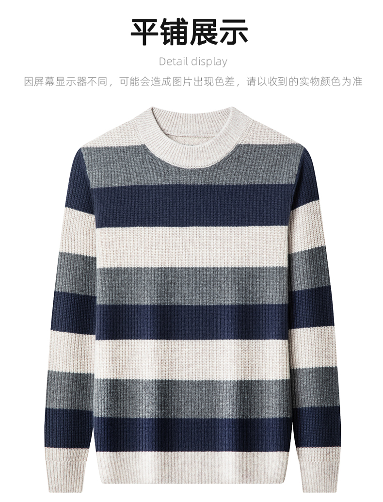 100%纯羊毛男士中青年拼色条纹休闲百搭圆领针织