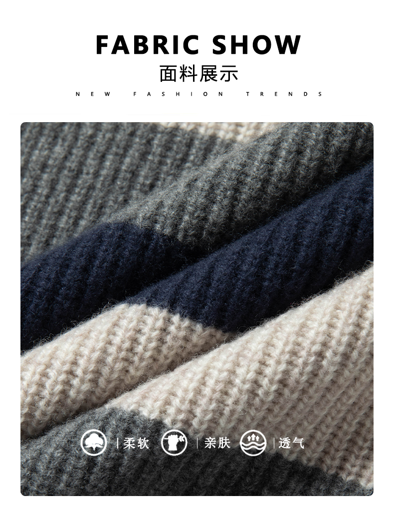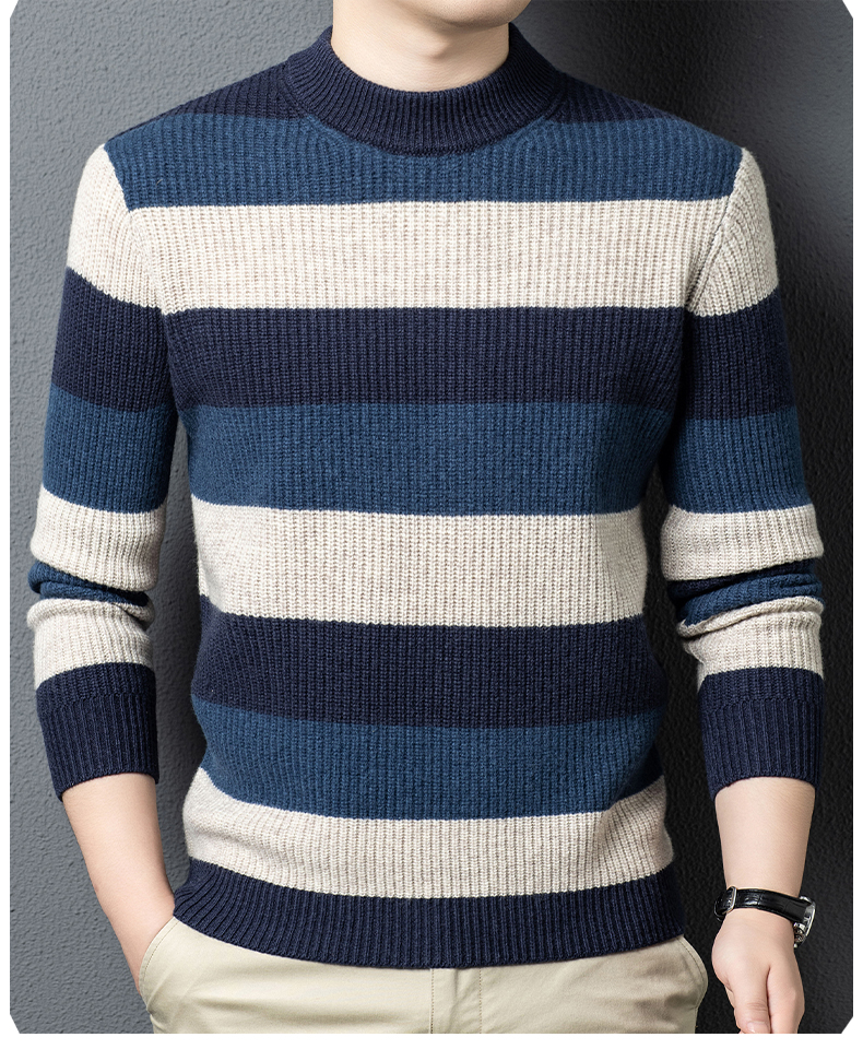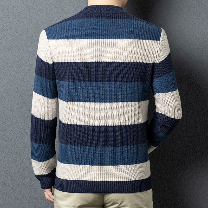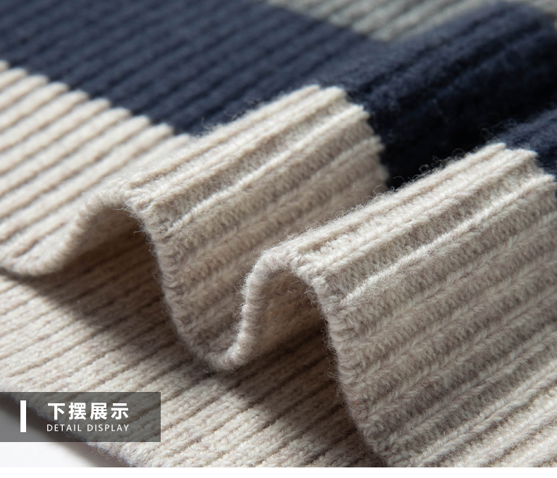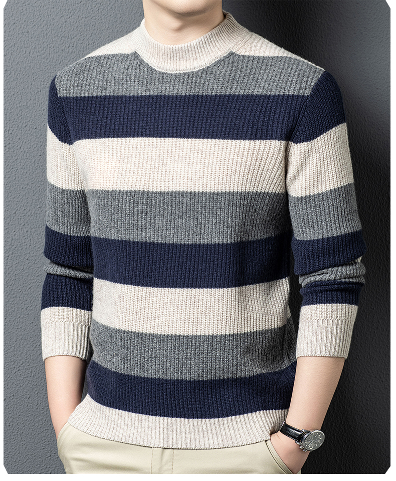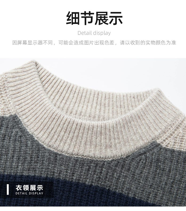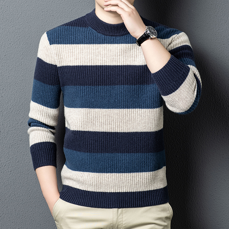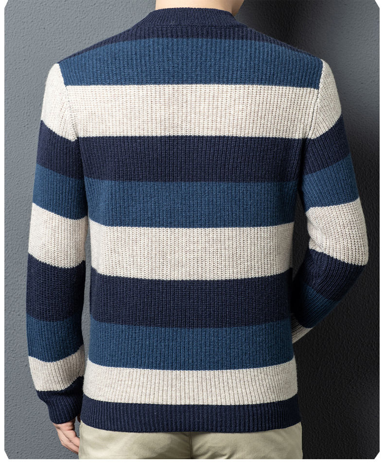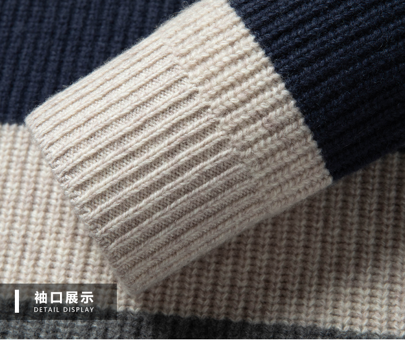 100%纯羊毛男士中青年拼色条纹休闲百搭圆领针织