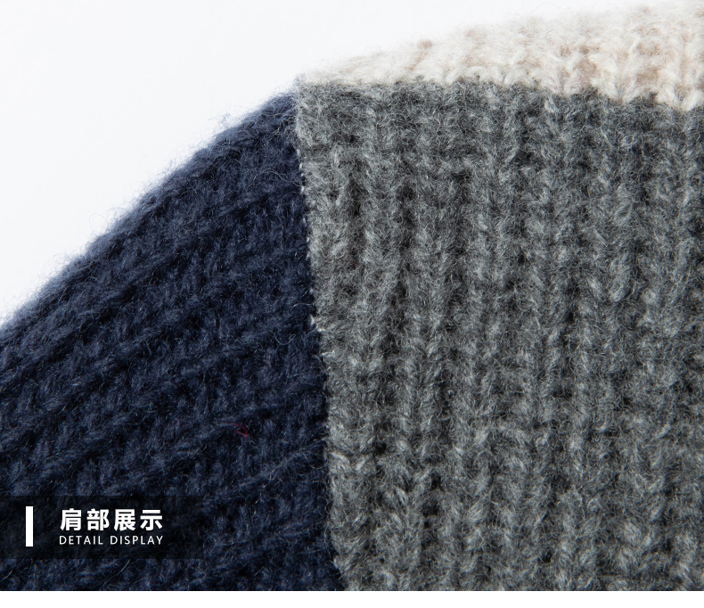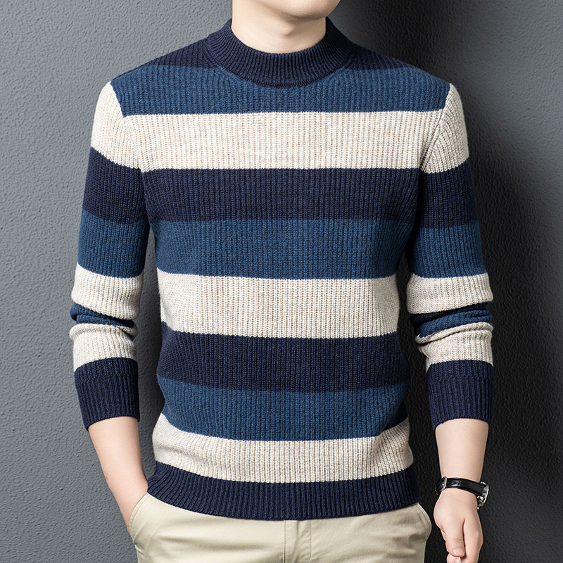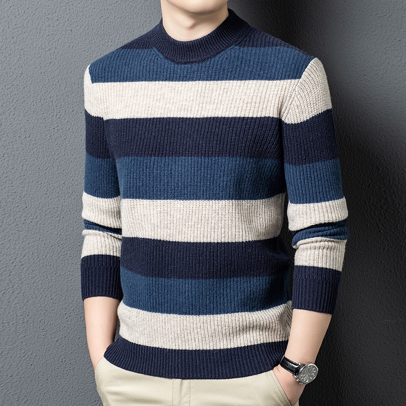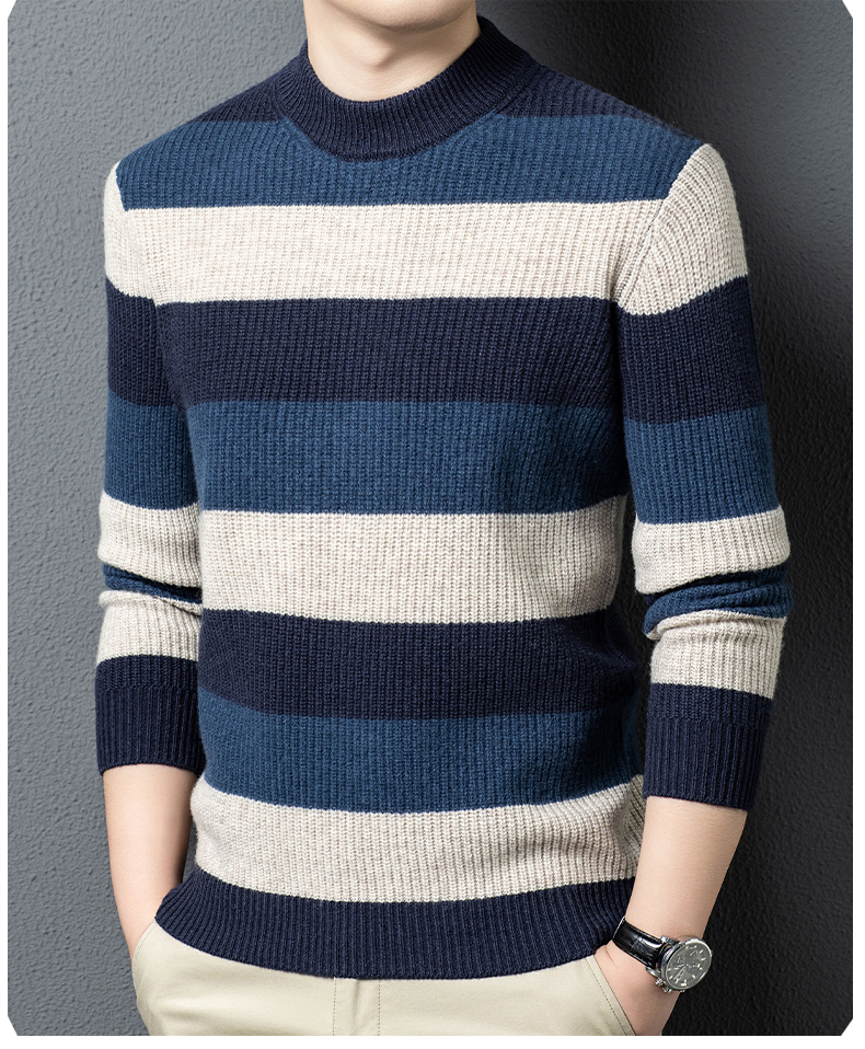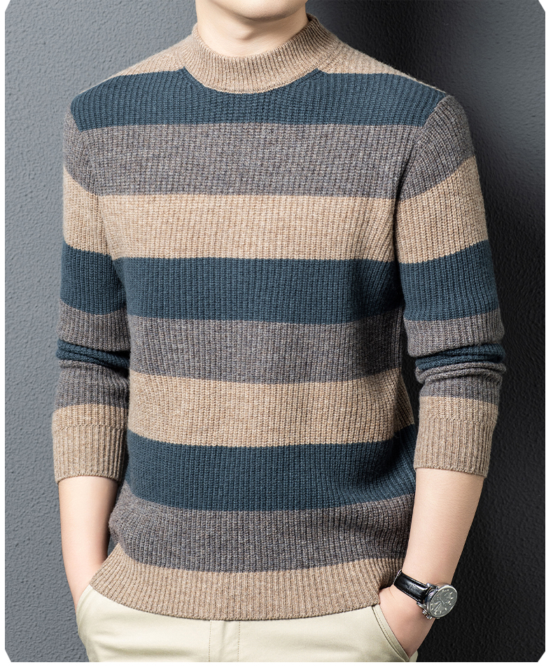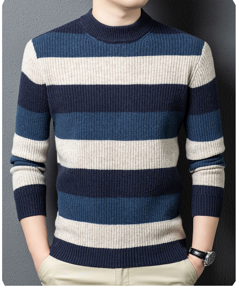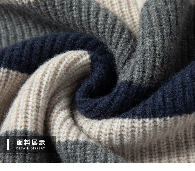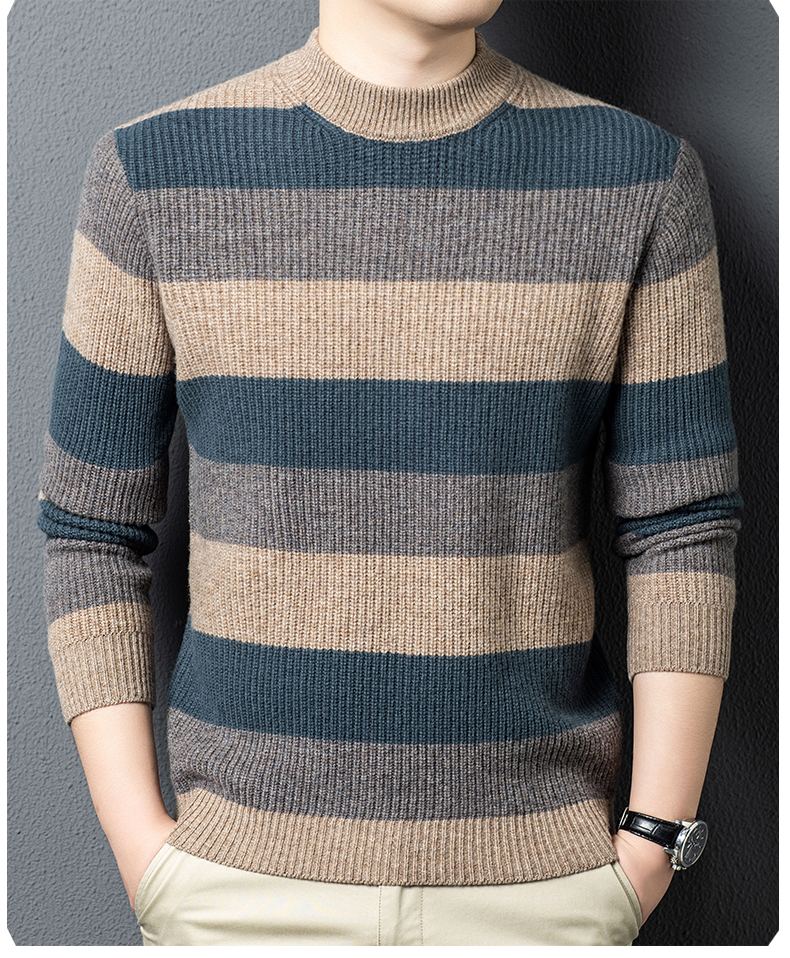100%纯羊毛男士中青年拼色条纹休闲百搭圆领针织
