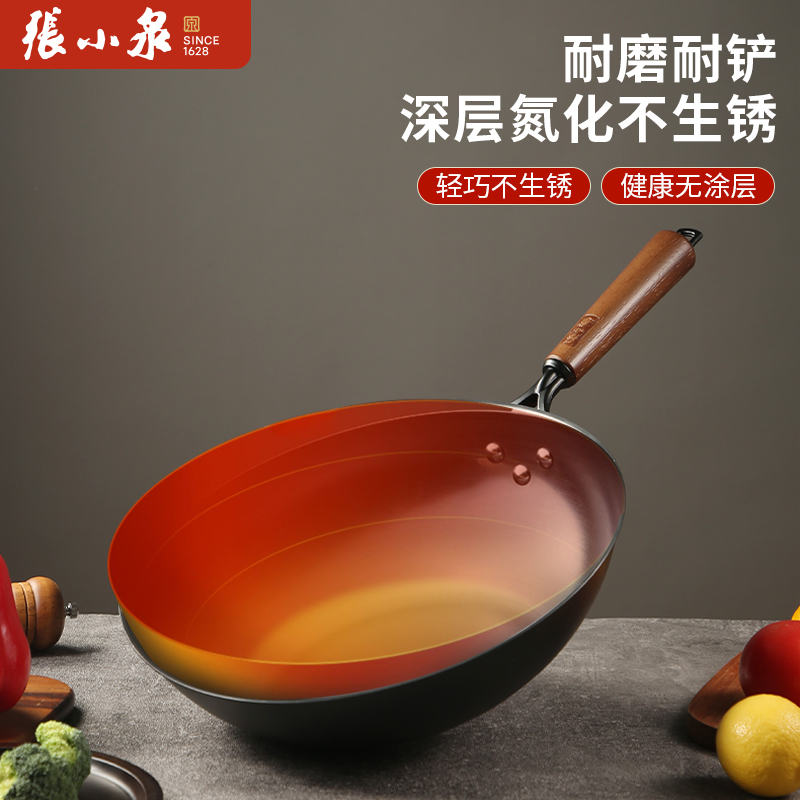 底部螺旋纹设计,不挑炉灶,不易拱底 轻量化锅身,女生也能轻松使用 耐磨耐铲,坚硬食材肆意炒 煎炒炸炖