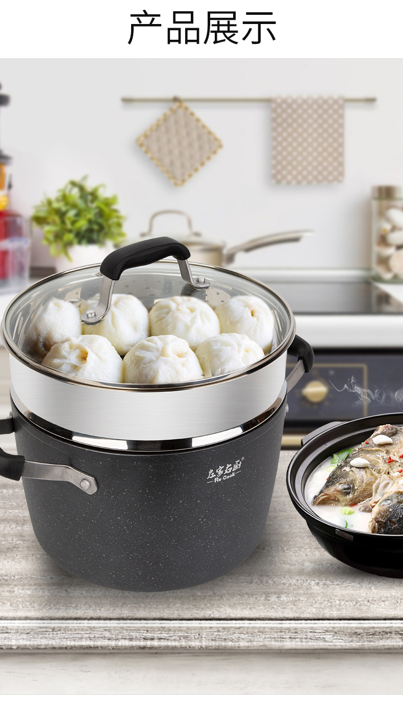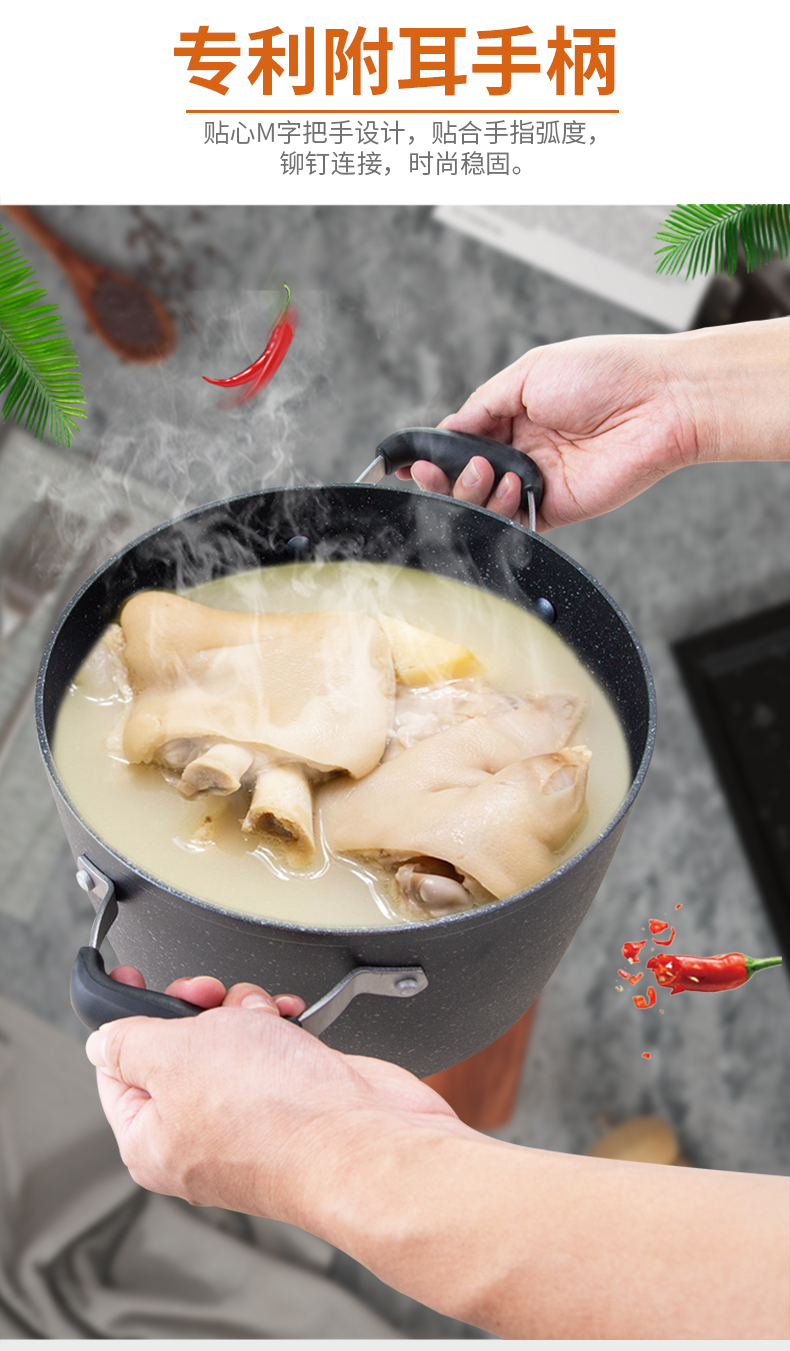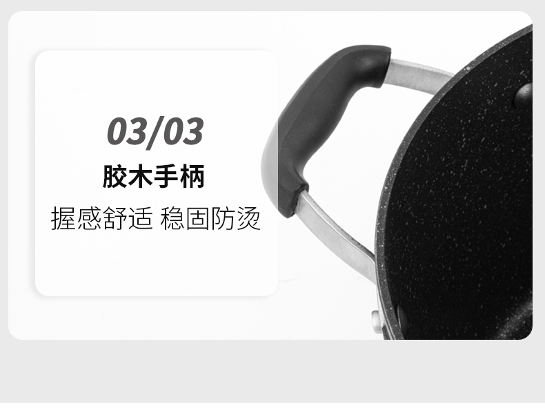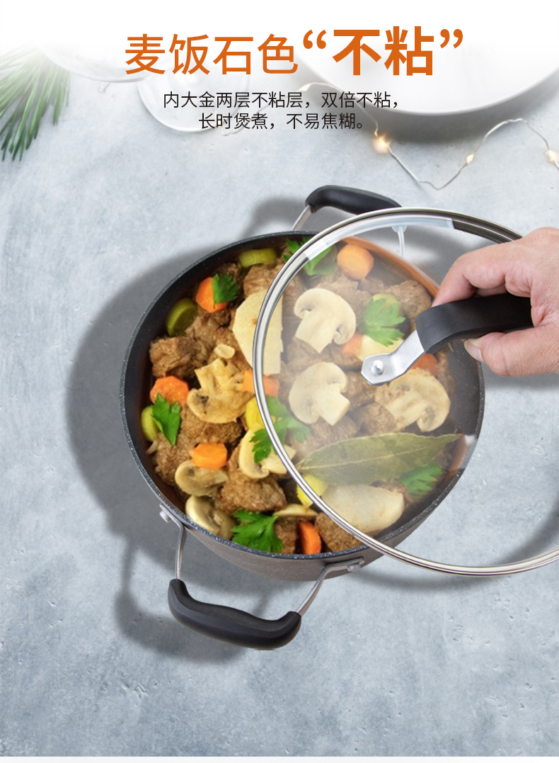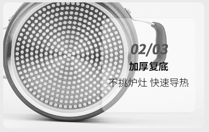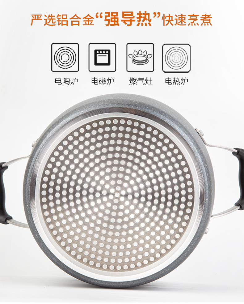 ●内美国华福麦饭石色不粘涂层,不粘性卓越,可降低食物对油脂的依赖,减少用油量,健康有保障。 ●锅身采