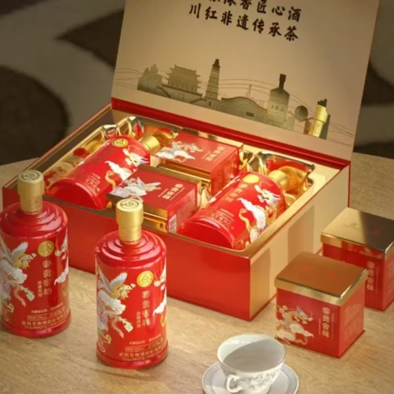 宜酒宜茶,一壶川红茶 一杯浓香酒,‌五粮液富贵吉祥酒‌是宜宾五粮液股份有限公司出品的一款高端浓香型白