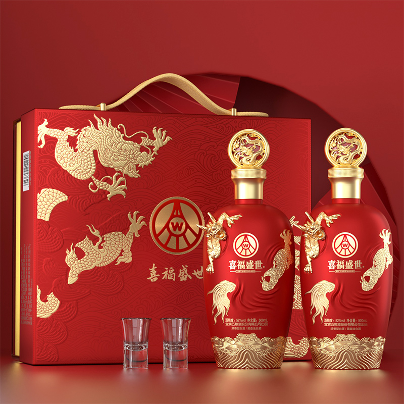 五粮液 股份出品 喜福盛世祥瑞双支礼盒52度浓香型(单位:盒 ) 红色