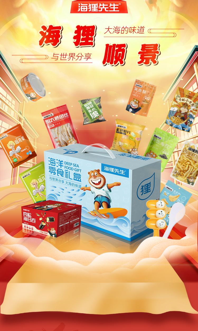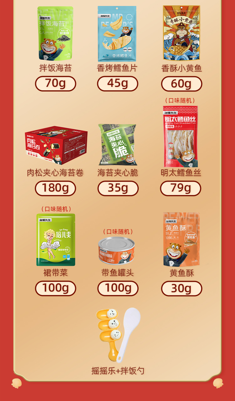 明太鳕鱼丝79g/袋 「海狸先生」油炸鱿鱼丝33g/袋 「海狸先生」生虾片150g/袋 香辣梗片100g/袋 拌饭海苔70g/袋 裙带菜100g/袋(口味随机)带鱼罐头100g 香酥小黄鱼60g/袋 肉松夹心海苔卷180g/盒 芝麻夹心海苔脆35g 黄鱼酥30g/袋 香烤鳕鱼片45g/袋饭团神器(摇摇乐+拌饭勺)