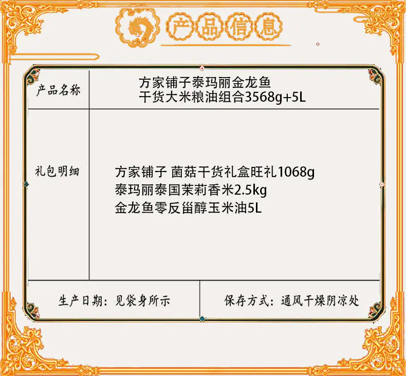 【京东配送】方家铺子泰玛丽金龙鱼干货大米粮油组合3568g+5L默认/1件装