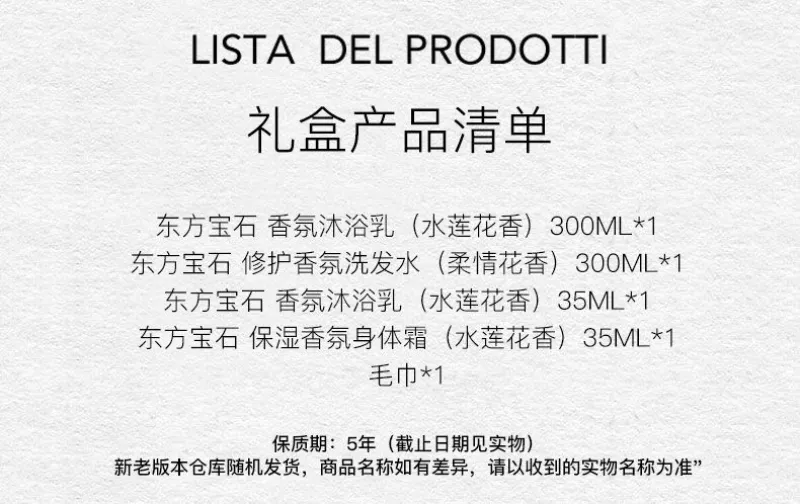 香氛沐浴乳(水莲花香)300ml*1+修护香氛洗发水(柔情花香)300ml*1+香氛沐浴乳(水莲花香)35ml*1+保湿身体霜(水莲花香)35ml*1+毛巾*1/1套装