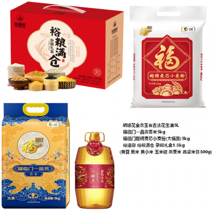 胡姬花花生油5L福临门香米5kg福临门小麦粉5kg裕道府杂粮礼盒1.8kg-500-yw