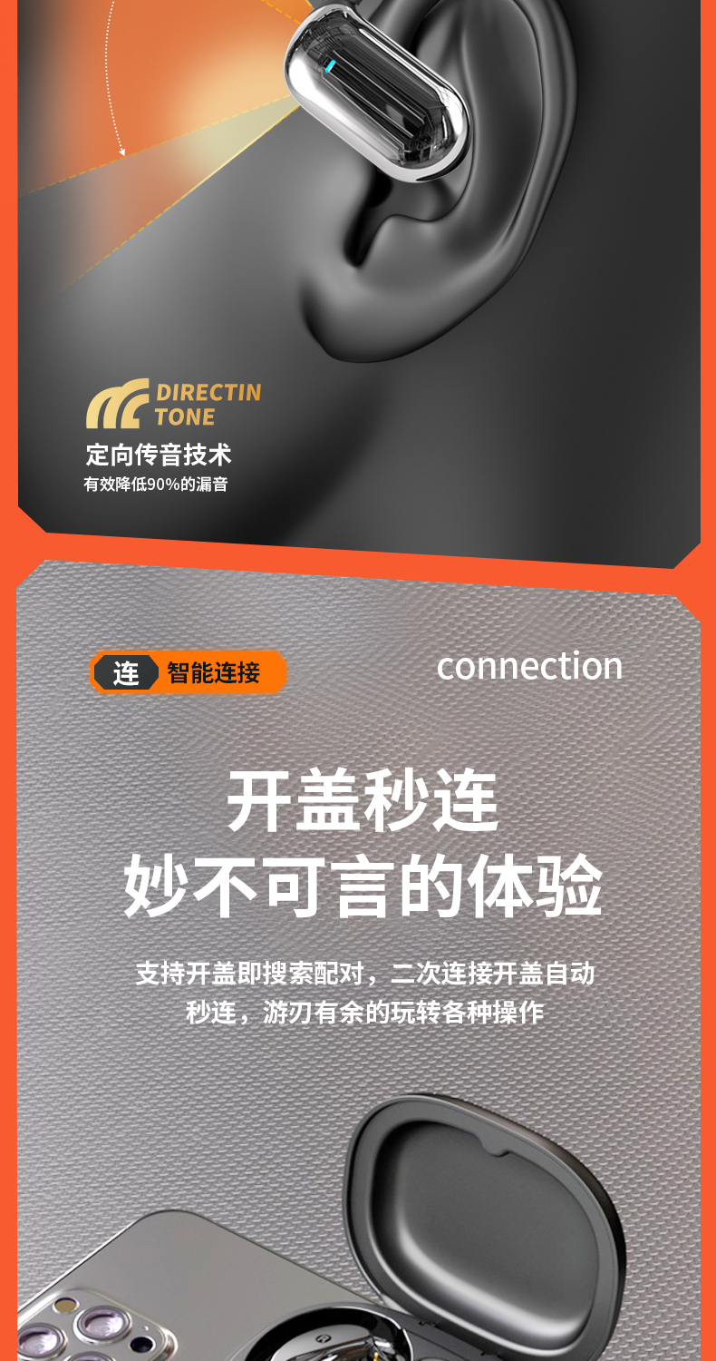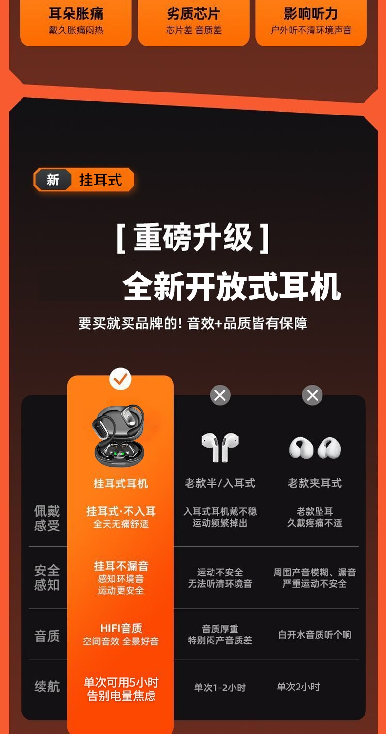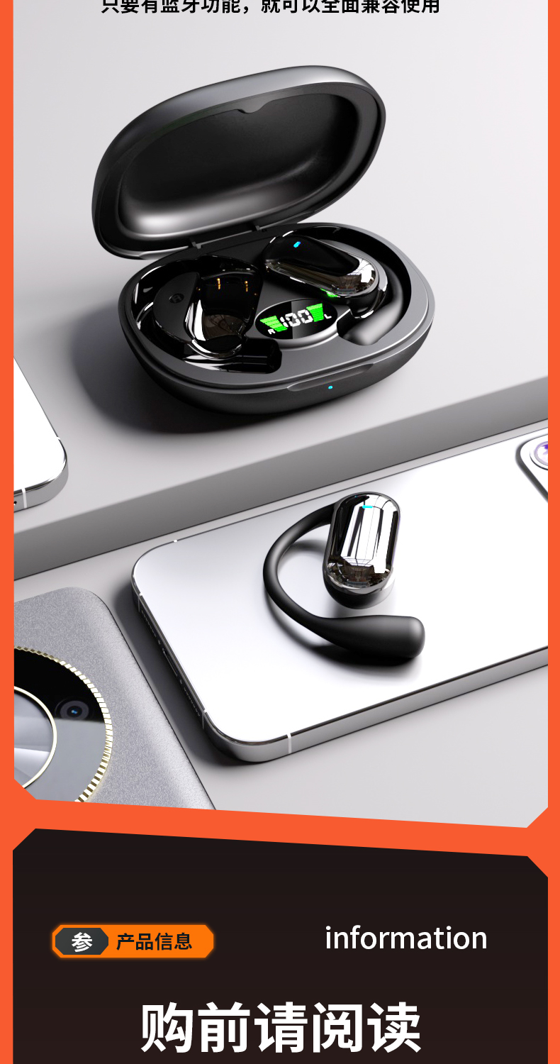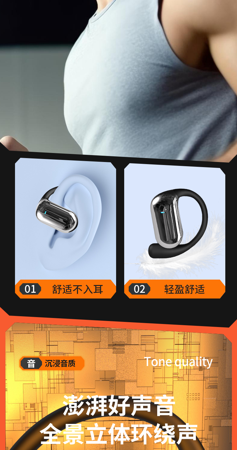 耳挂式设计、长时间佩戴舒适、通话降噪、定向传声、HIFI级音质、电量显示、触控操作、自动配对、佩戴舒