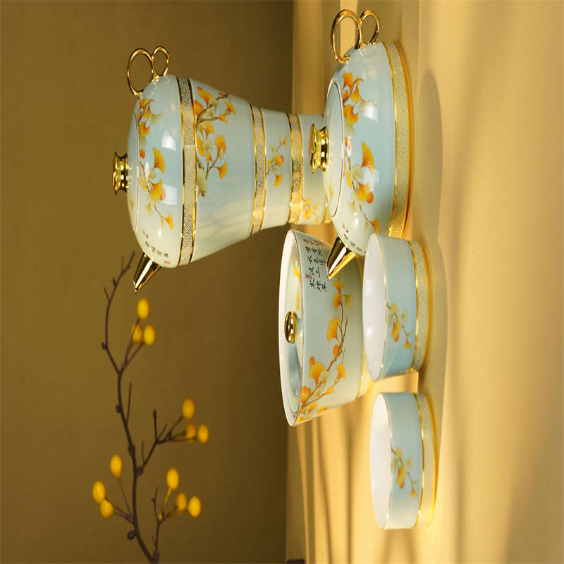本作品源自于经典梅瓶造型,将梅瓶造型一分为四,一壶、一罐、两杯。器型表面以银杏叶为点缀,底部辅以万寿