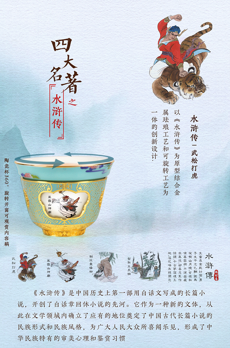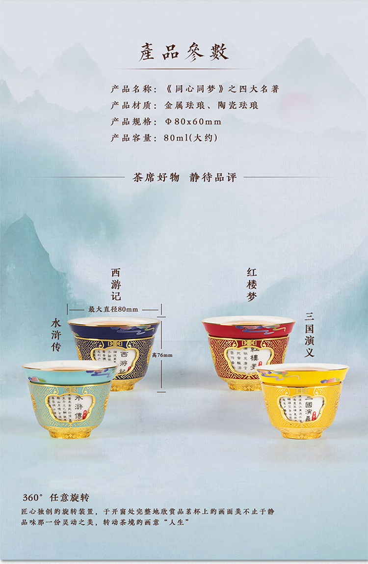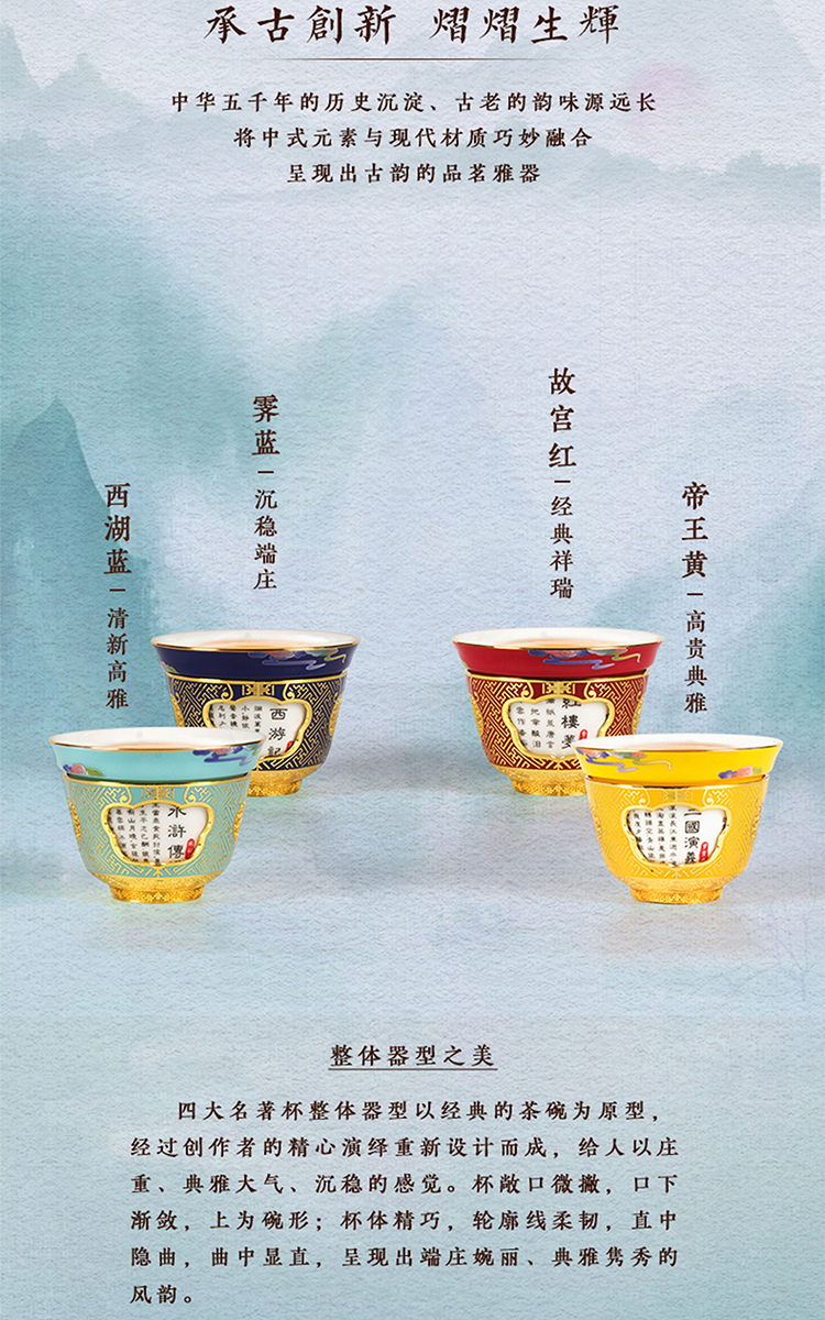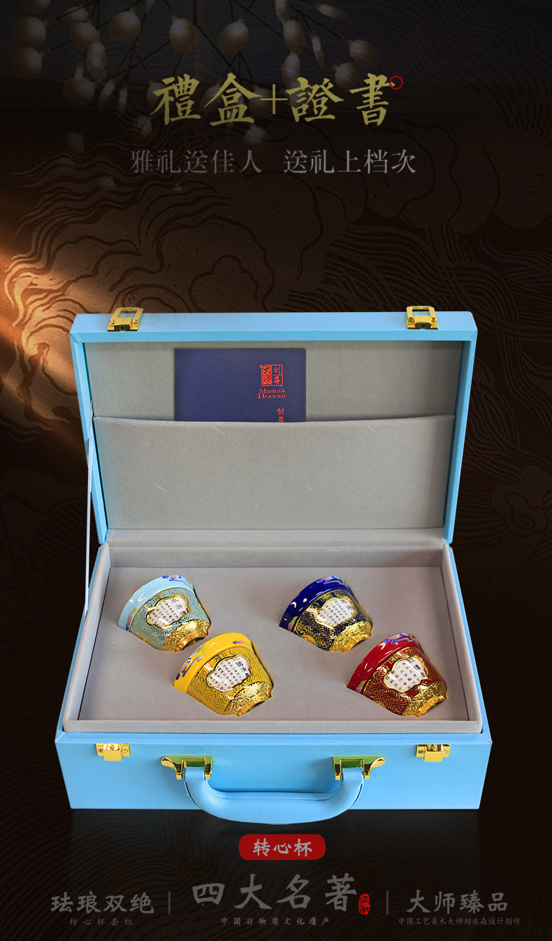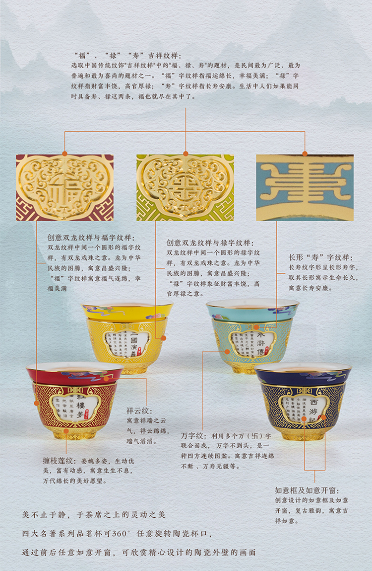 四大名著杯整体器型以经典的盖碗为原型,经过作者的精心演绎重新设计而成,给人以庄重、典雅大气、沉稳的感