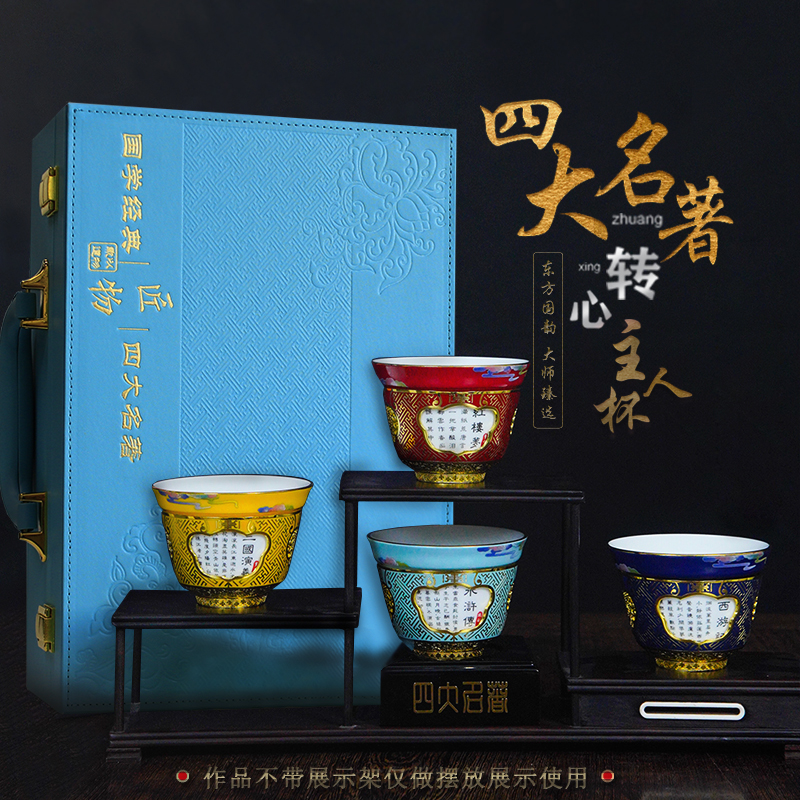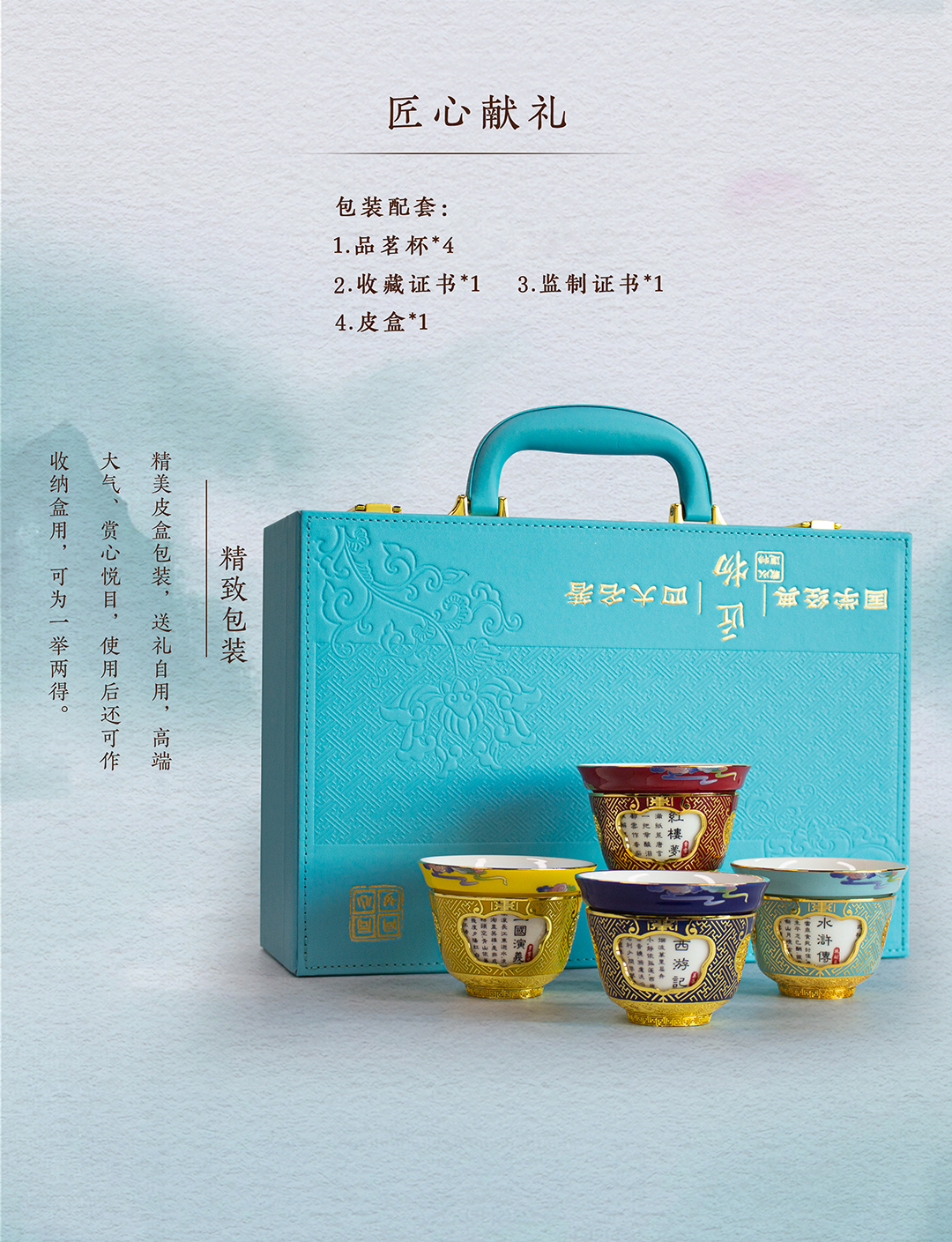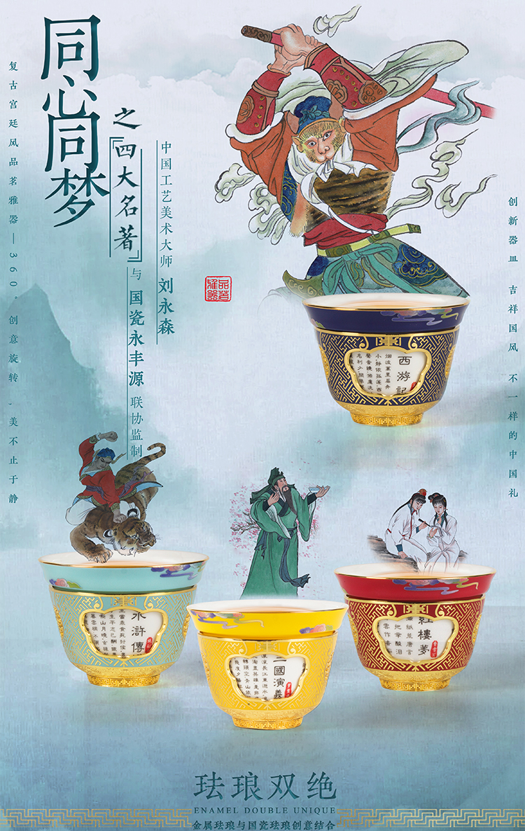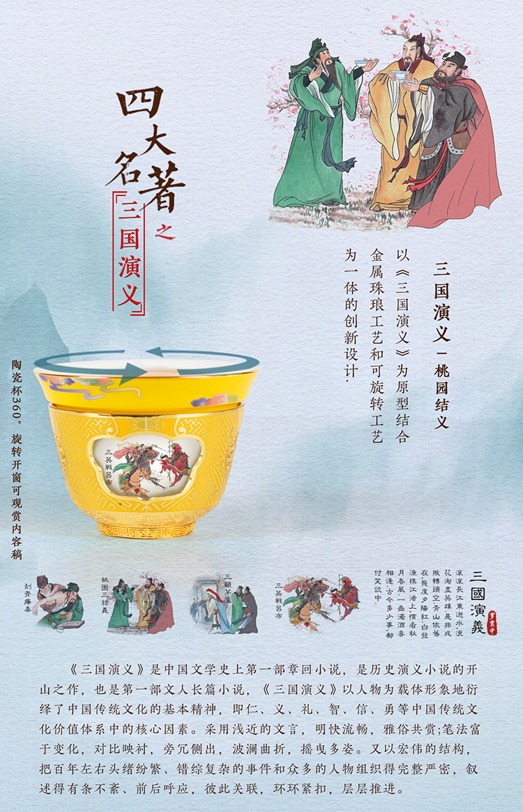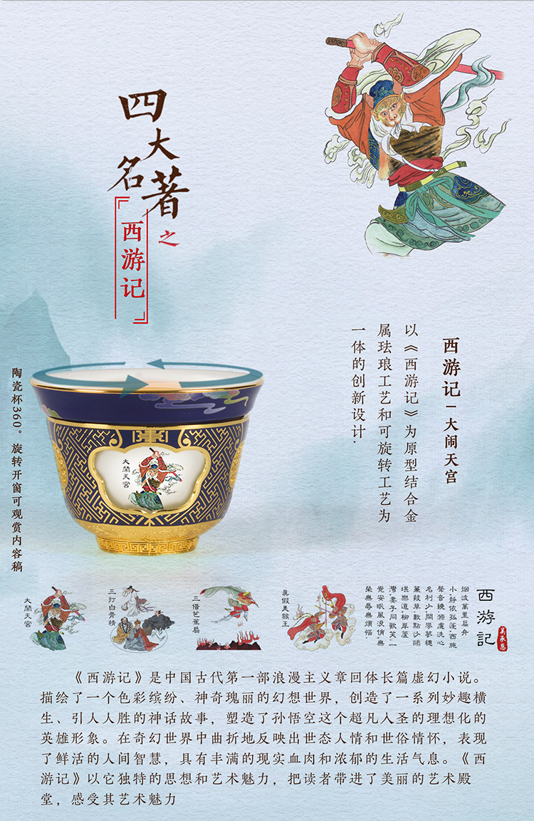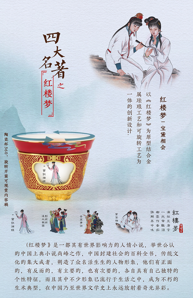 四大名著杯整体器型以经典的盖碗为原型,经过作者的精心演绎重新设计而成,给人以庄重、典雅大气、沉稳的感