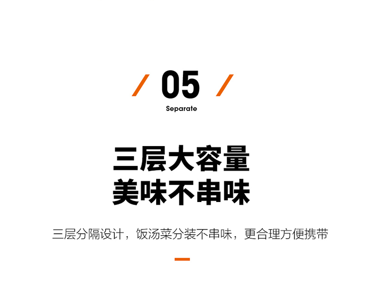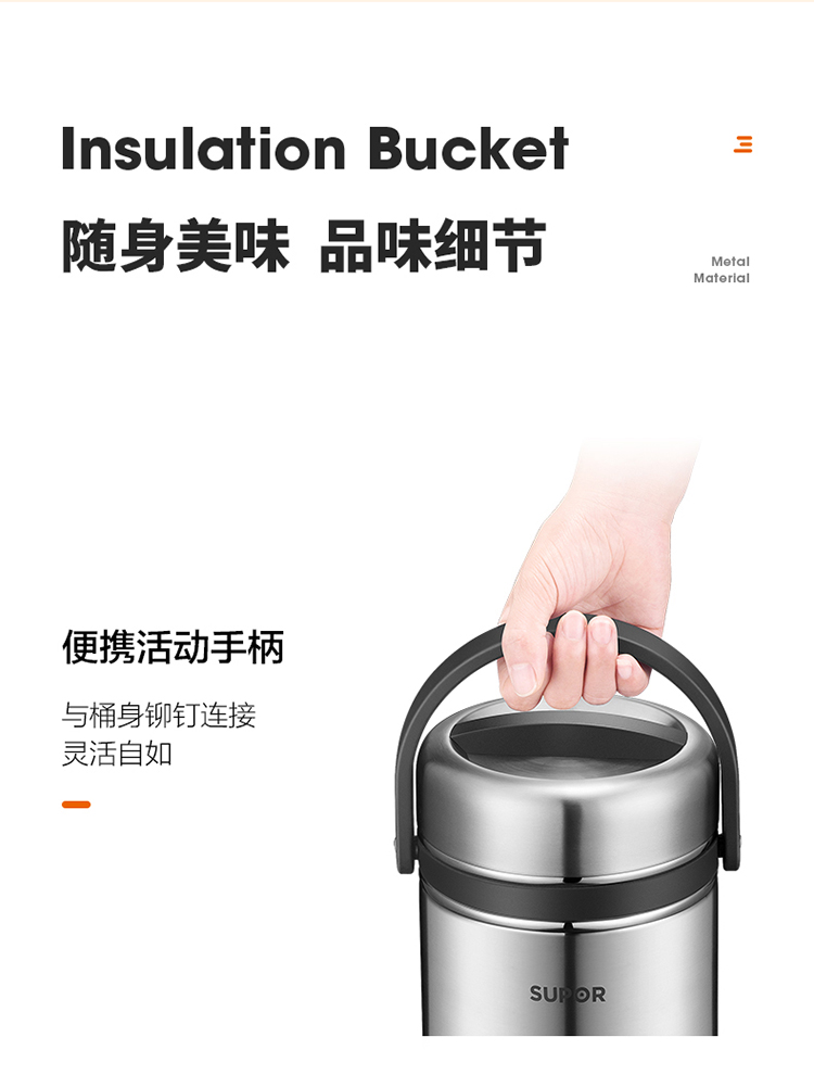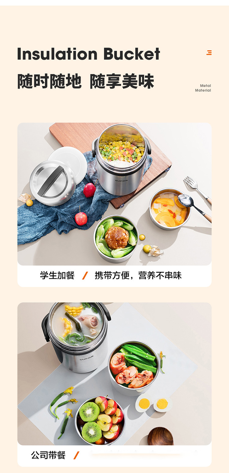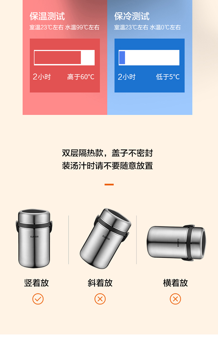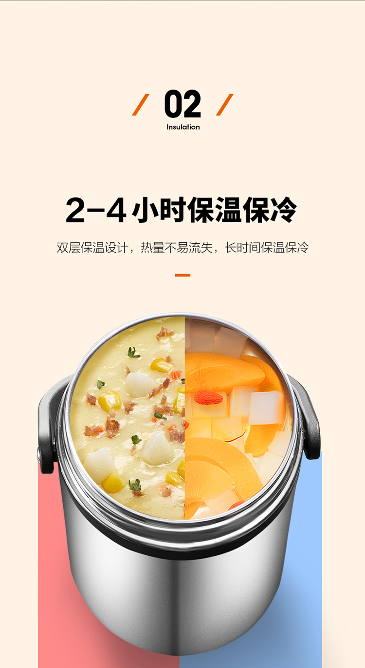 1.双层保温结构,具有保温/保冷功能 2.食品接触304不锈钢材质,健康饮食更安全 3.防溢盖设计,