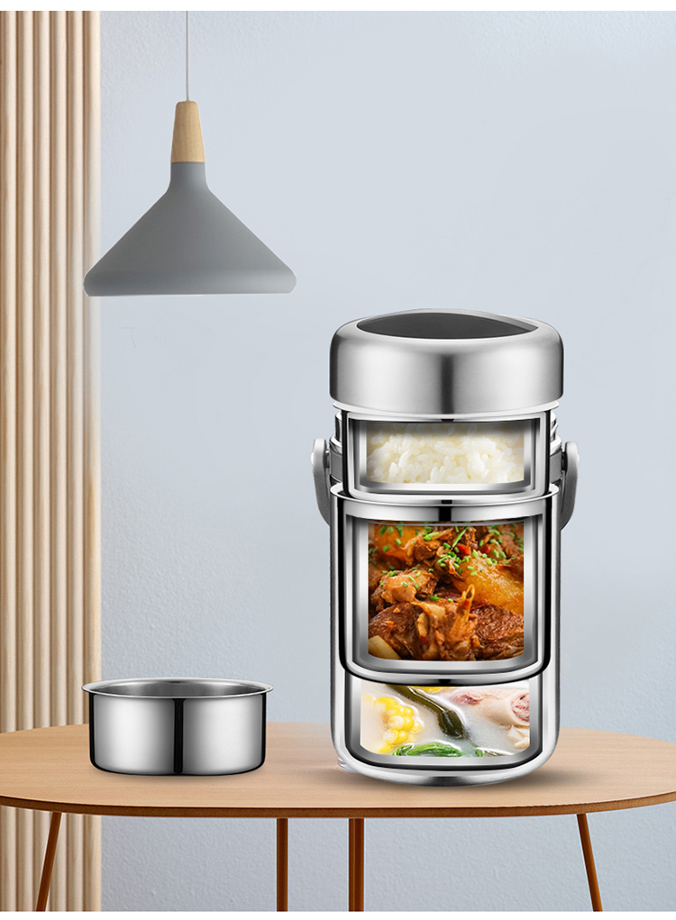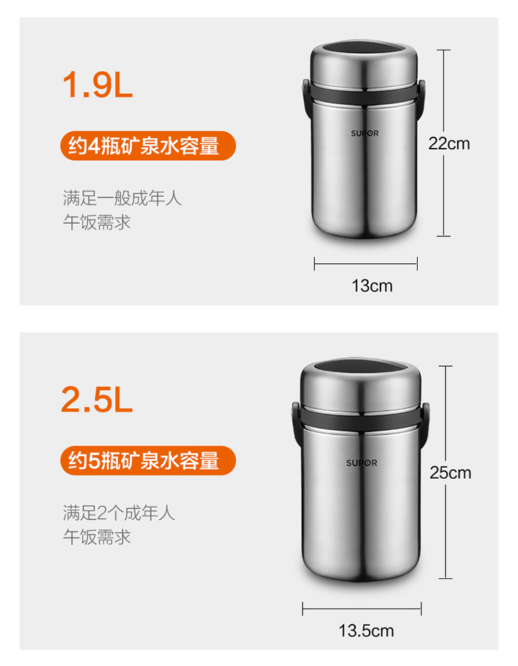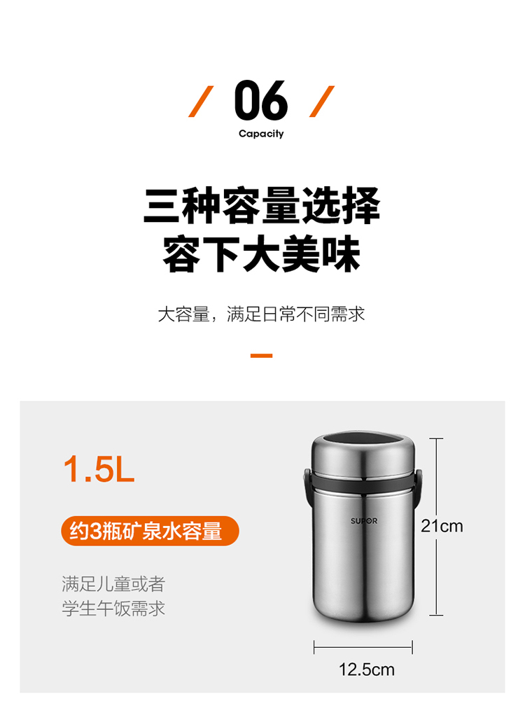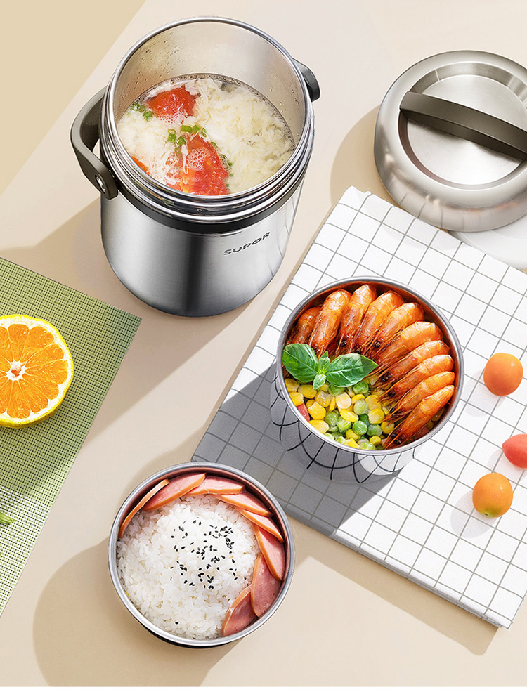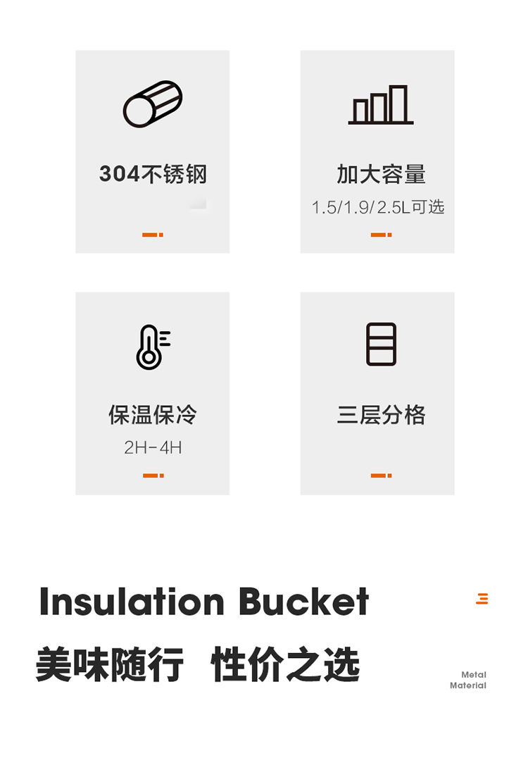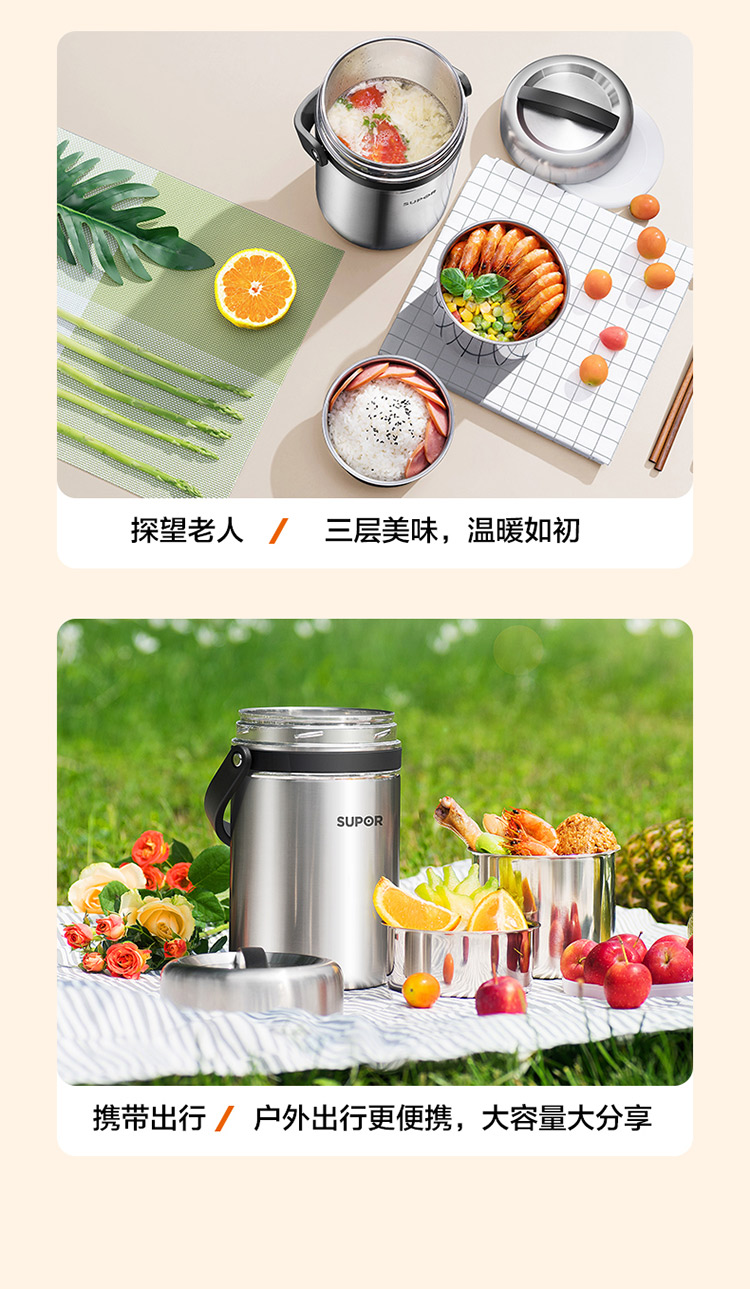 1.双层保温结构,具有保温/保冷功能 2.食品接触304不锈钢材质,健康饮食更安全 3.防溢盖设计,
