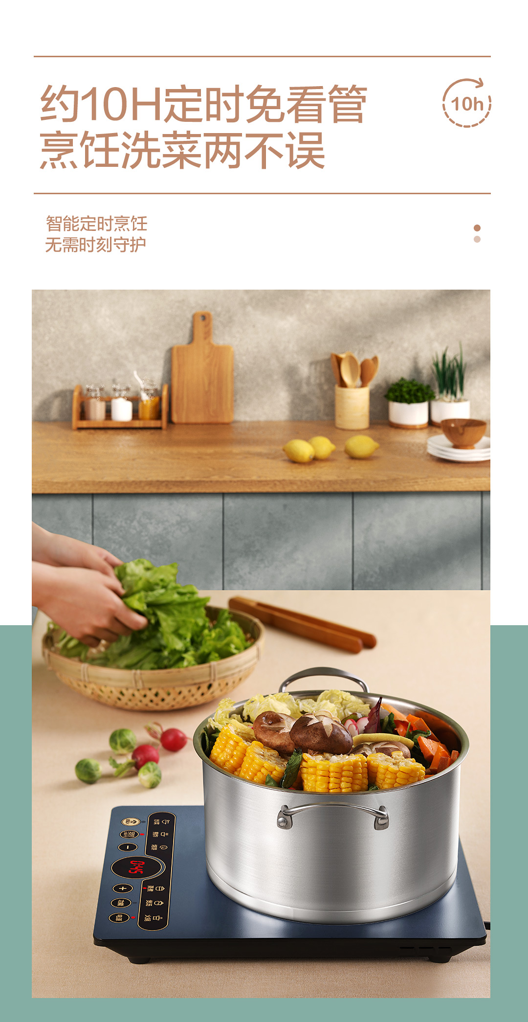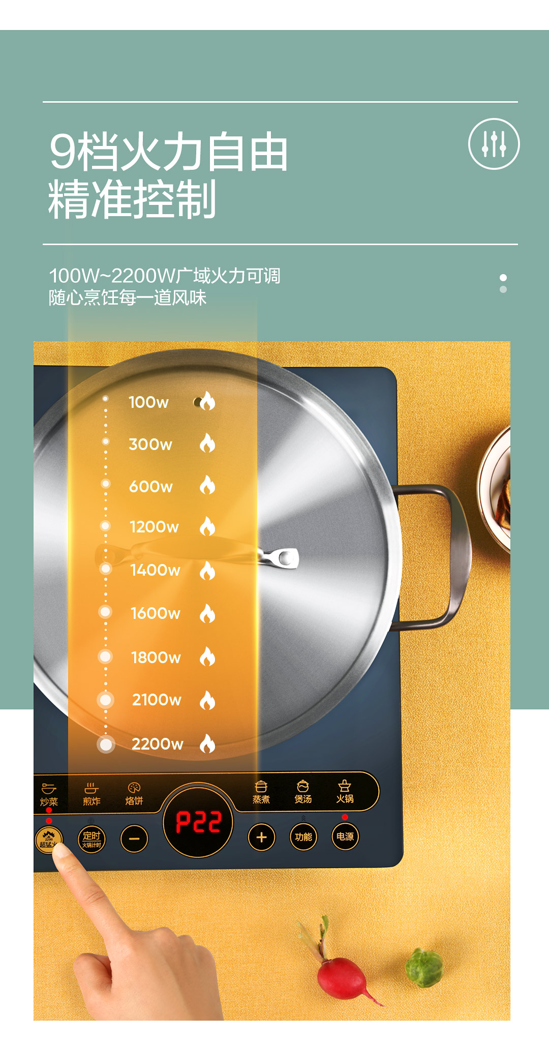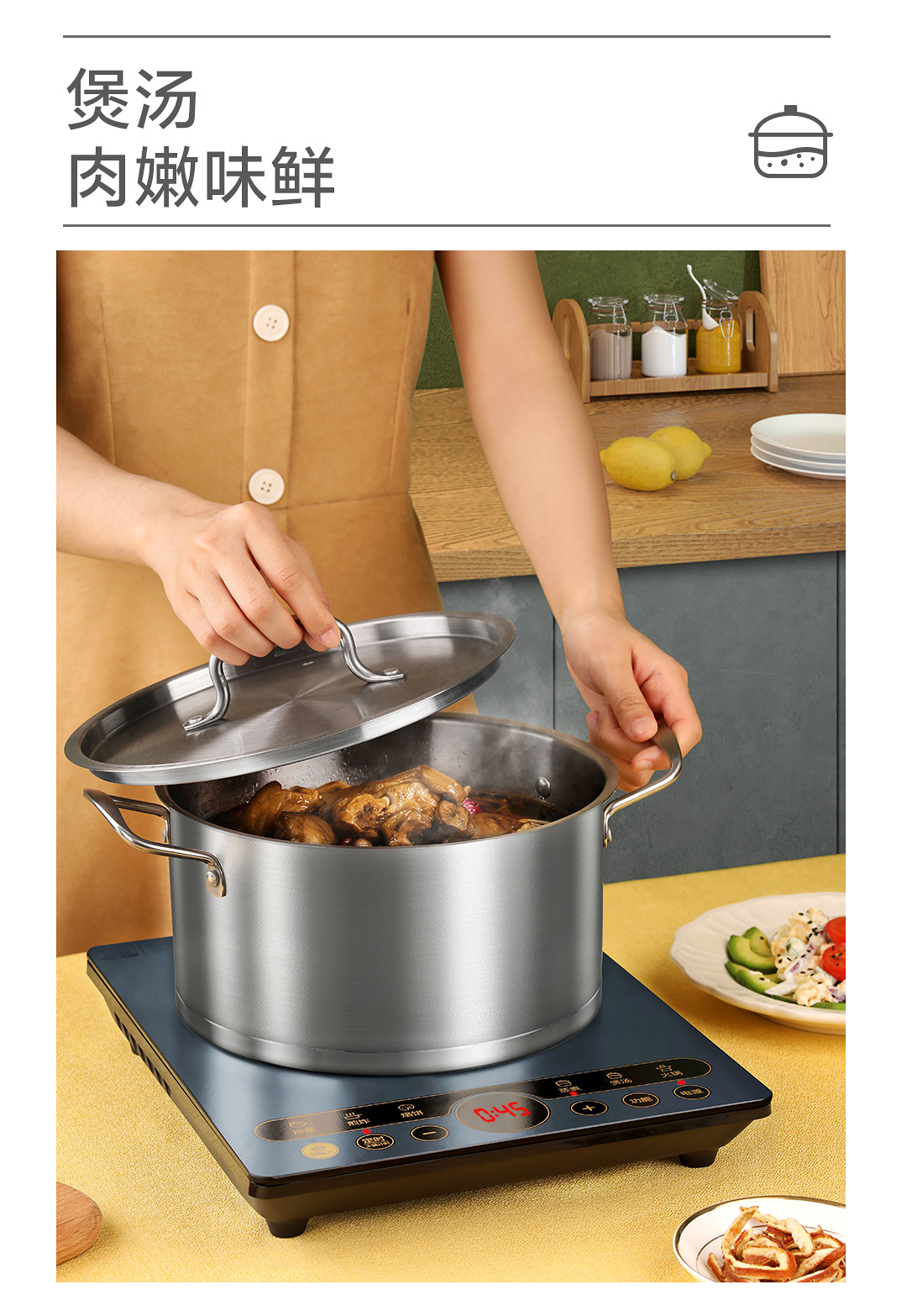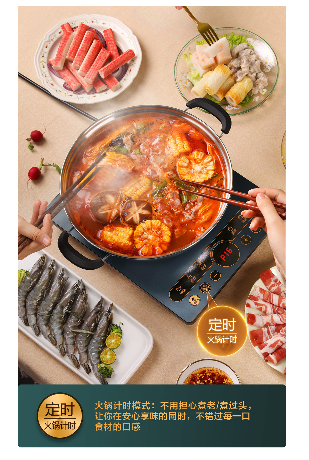 1.特色2200W大火力,升温更快,加热更均匀,锅具不易糊底,菜美味锅好洗; 2机器内设程序,煲炖不