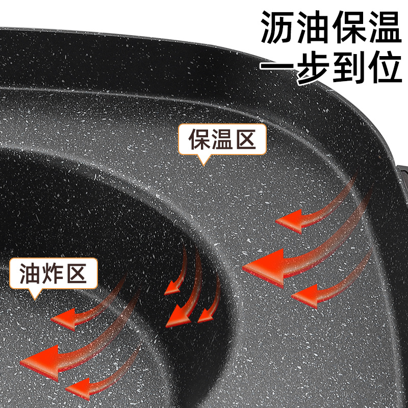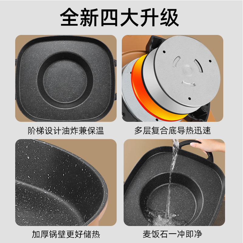5档智能控温,受热均匀不夹生,阶梯设计油炸兼保温,多层复合底导热迅速,加厚锅壁更好储热,麦饭石一冲即