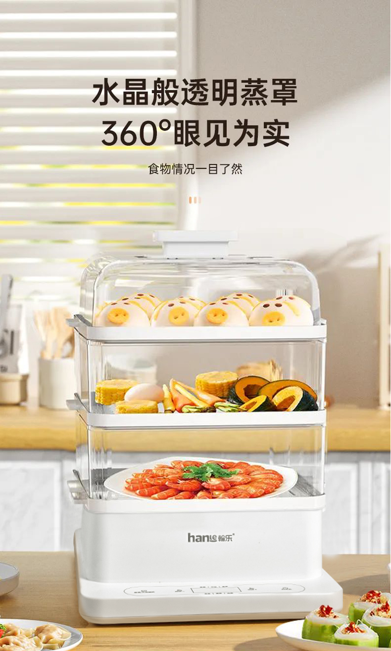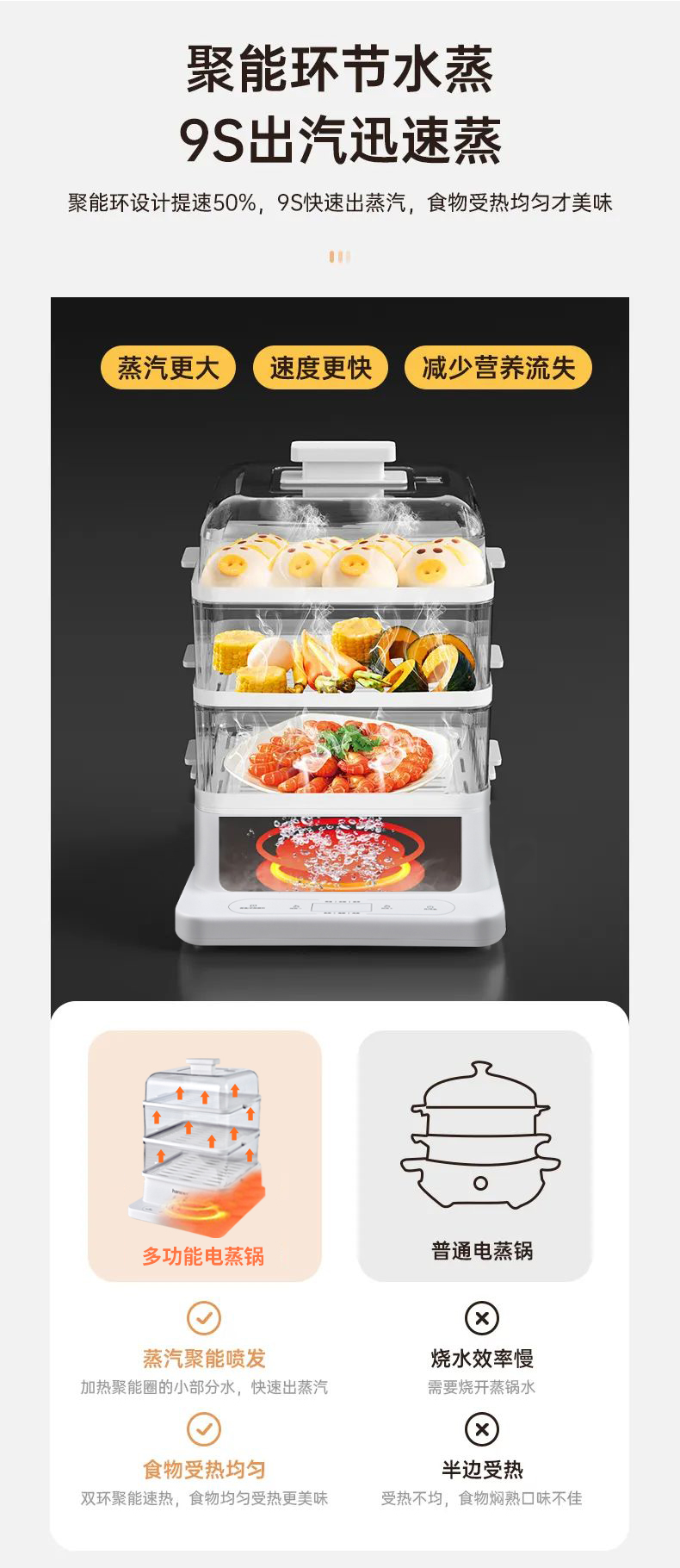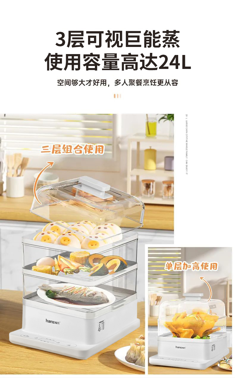 多功能电蒸锅,360°可视,总容量高达24L,分层蒸不串味,聚能喷发蒸汽,净水污水分体设计,易清洁更