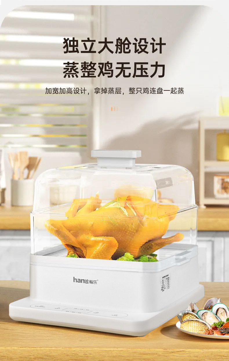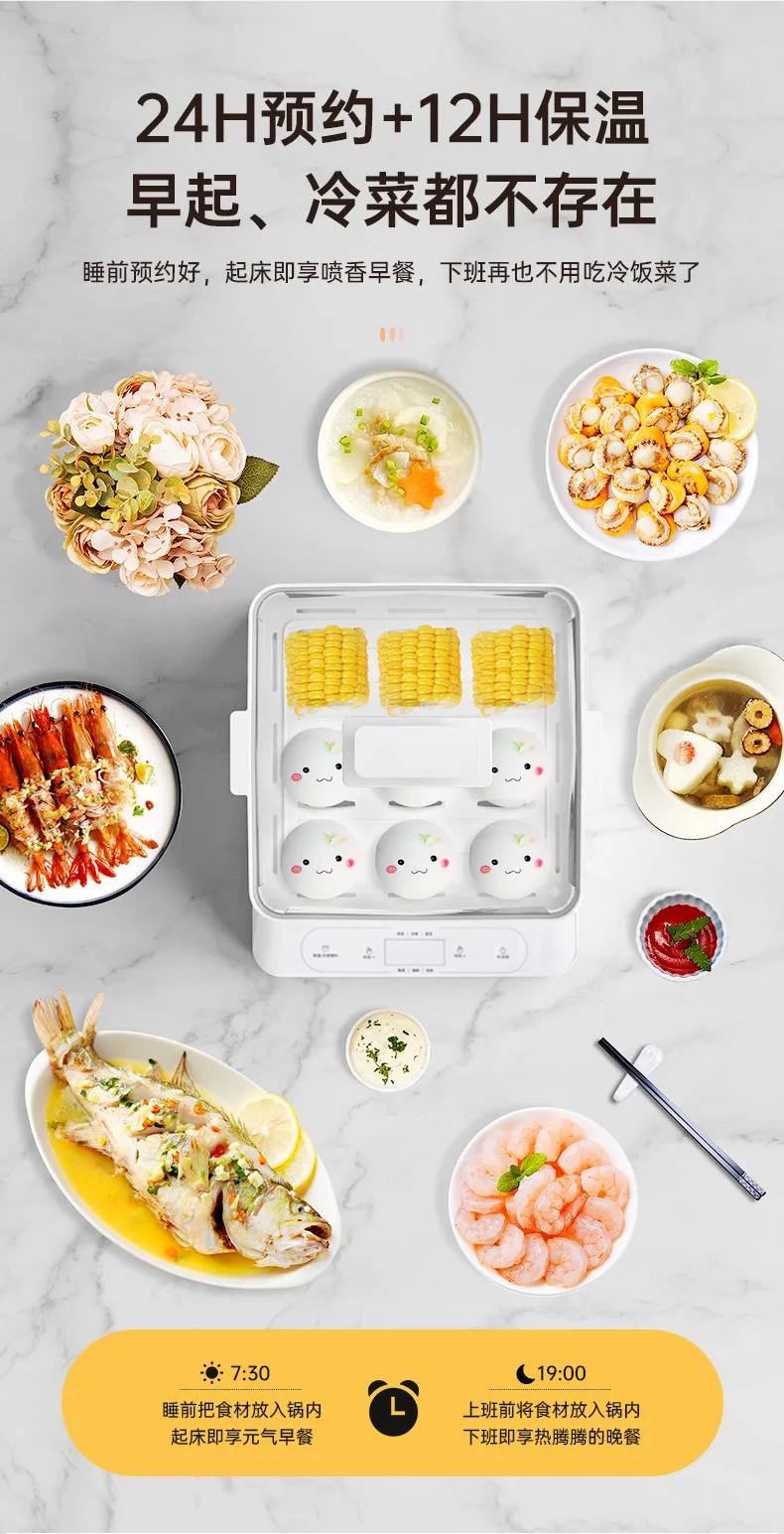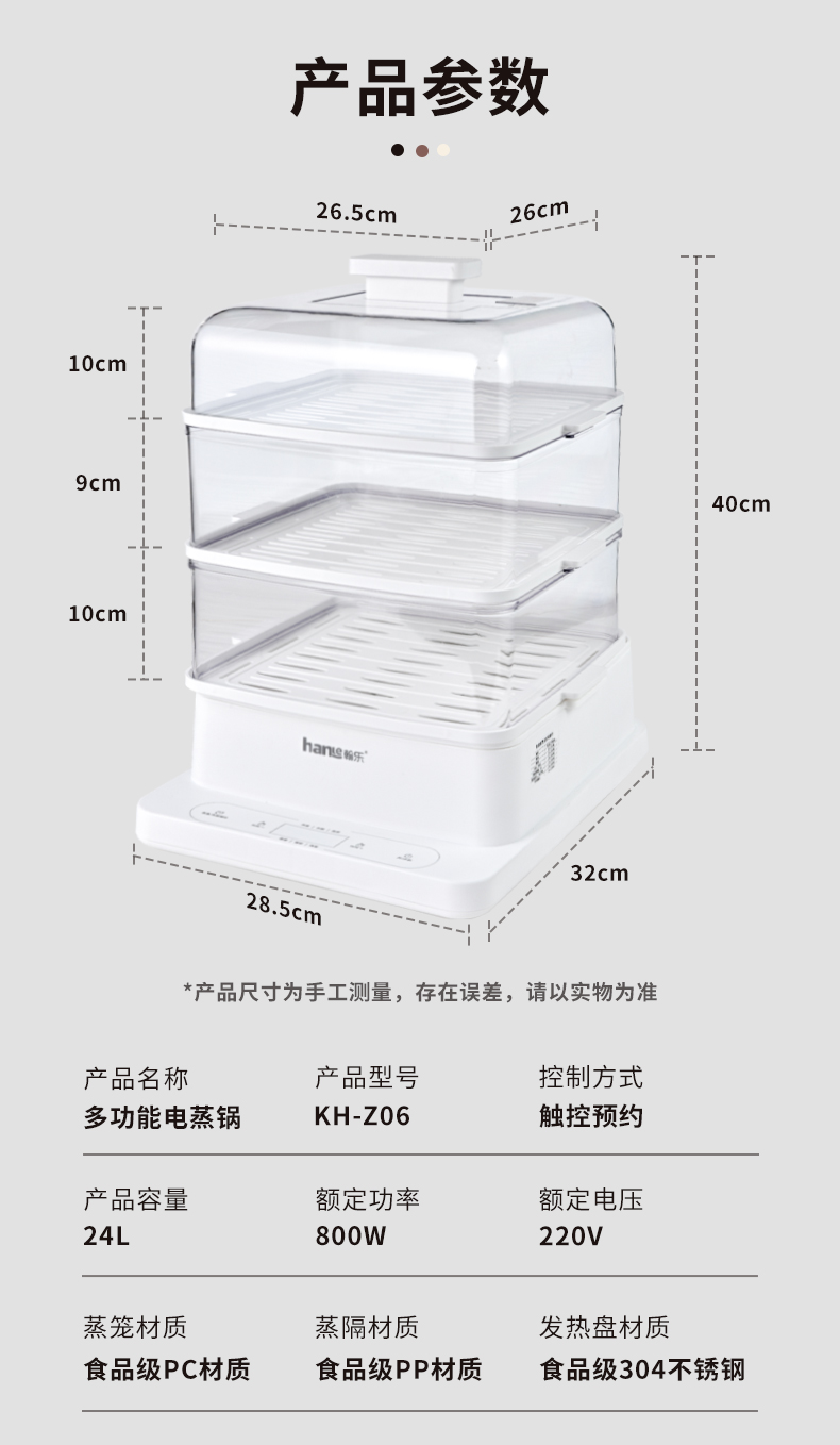 多功能电蒸锅,360°可视,总容量高达24L,分层蒸不串味,聚能喷发蒸汽,净水污水分体设计,易清洁更