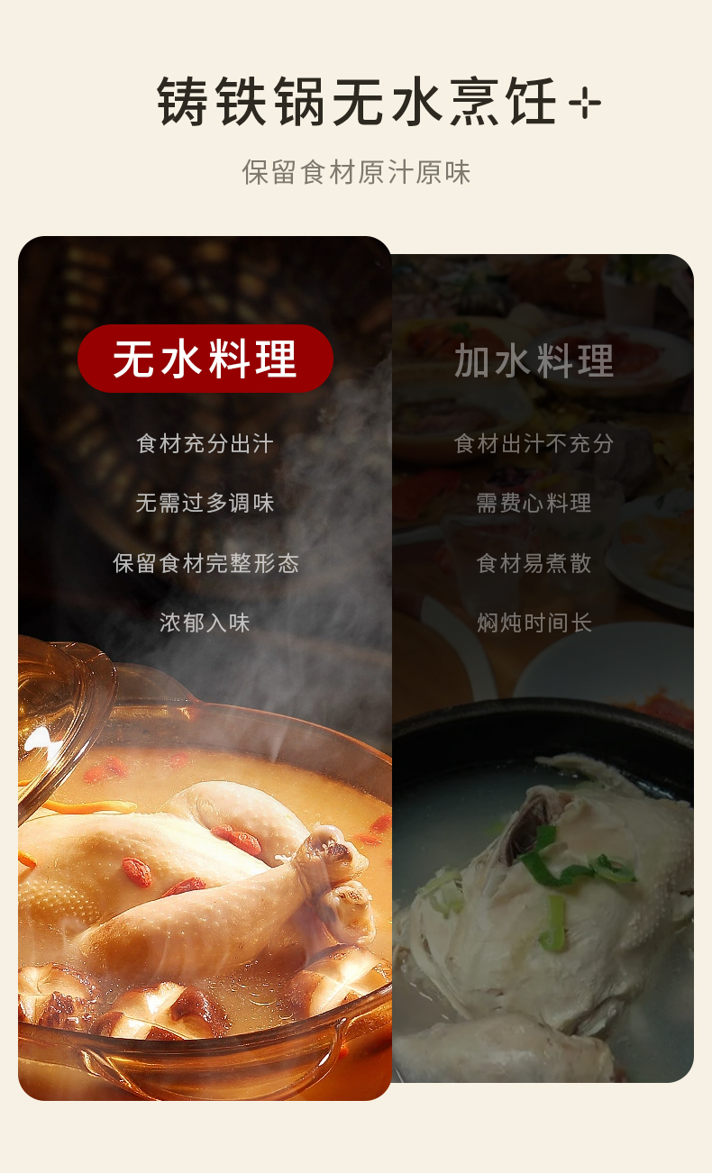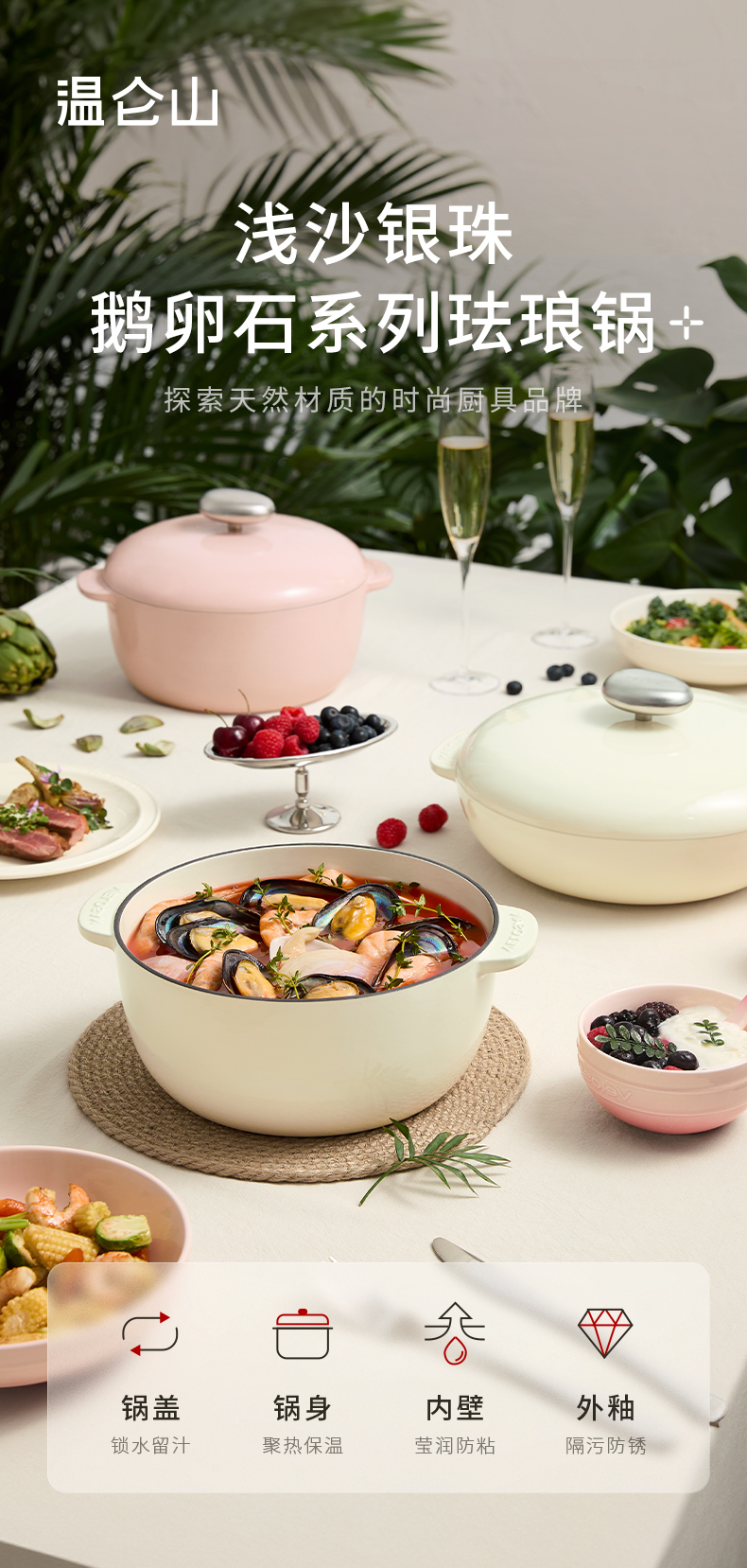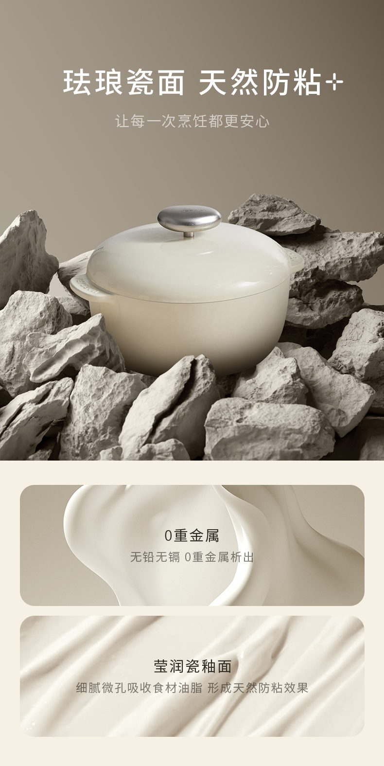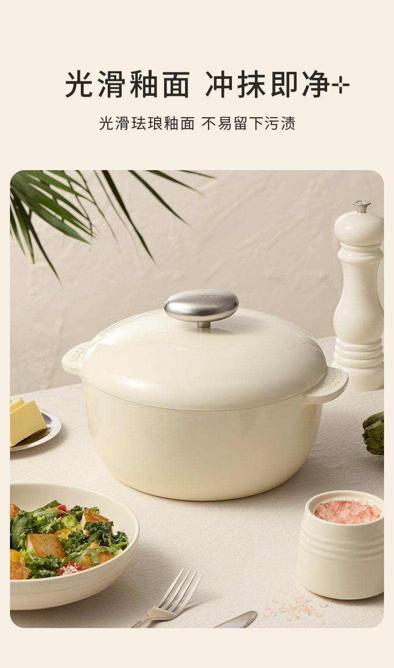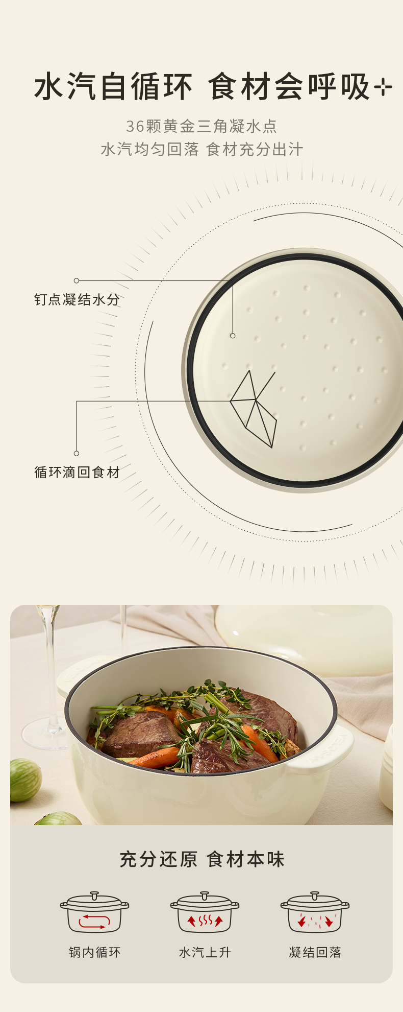 优选珐琅,高颜值,易清洁; 无水烹饪,锁住营养; 水汽自循环,保留鲜味; 均匀导热,聚热环保; 厚实