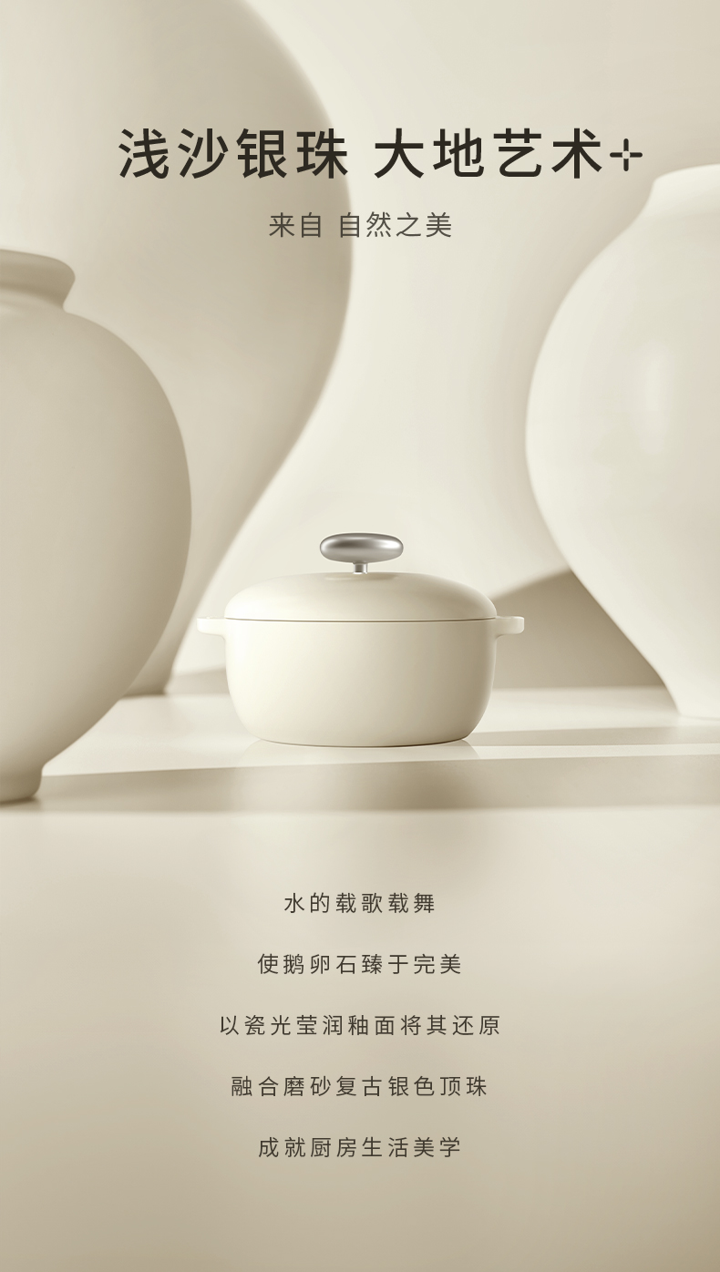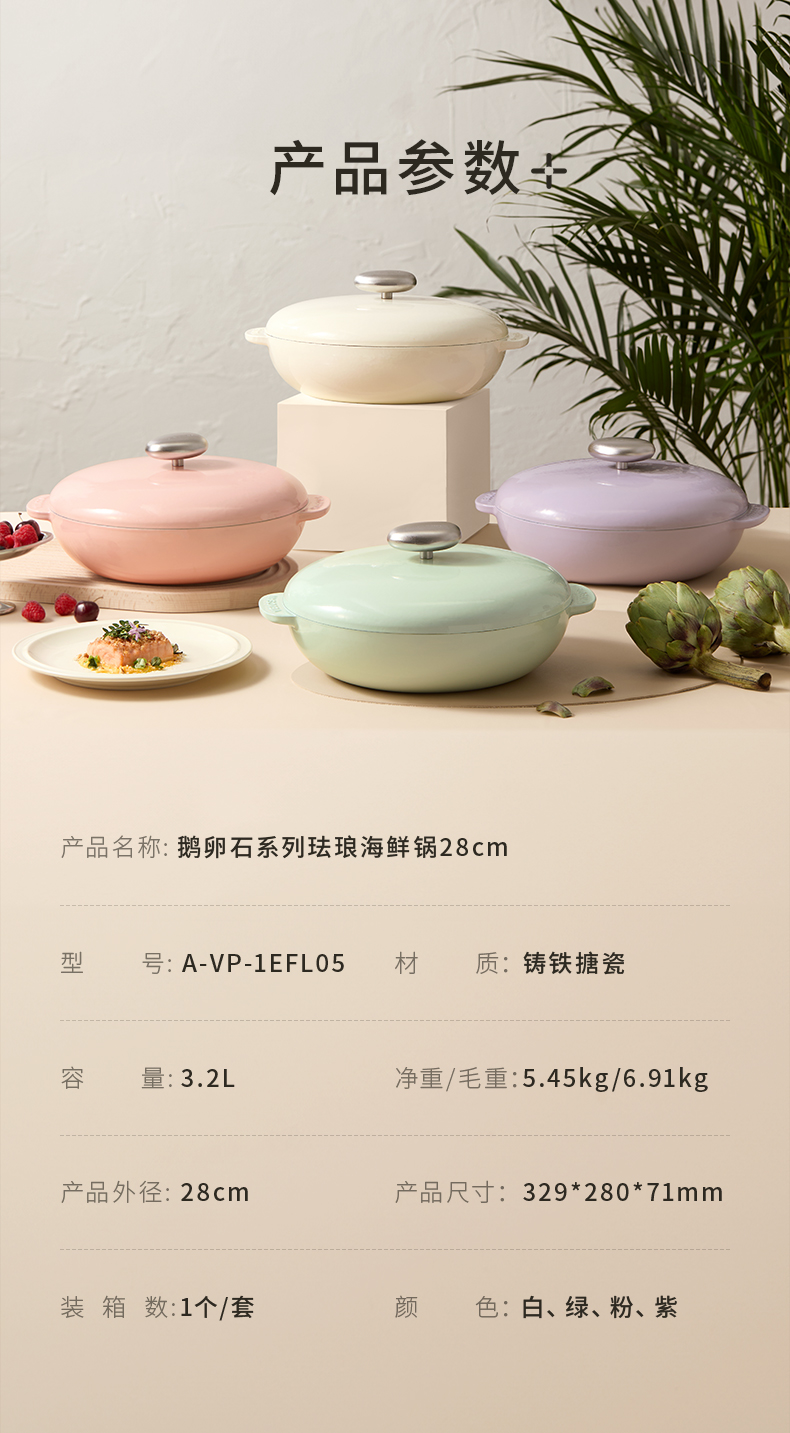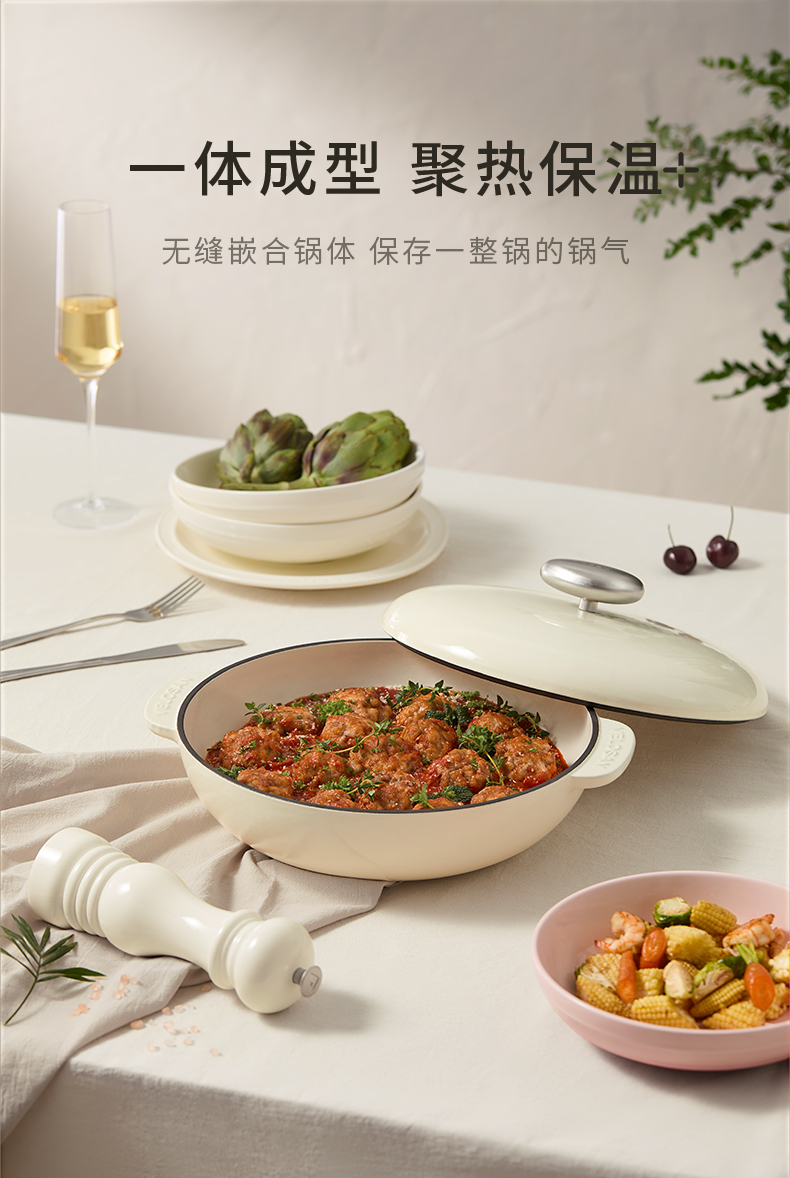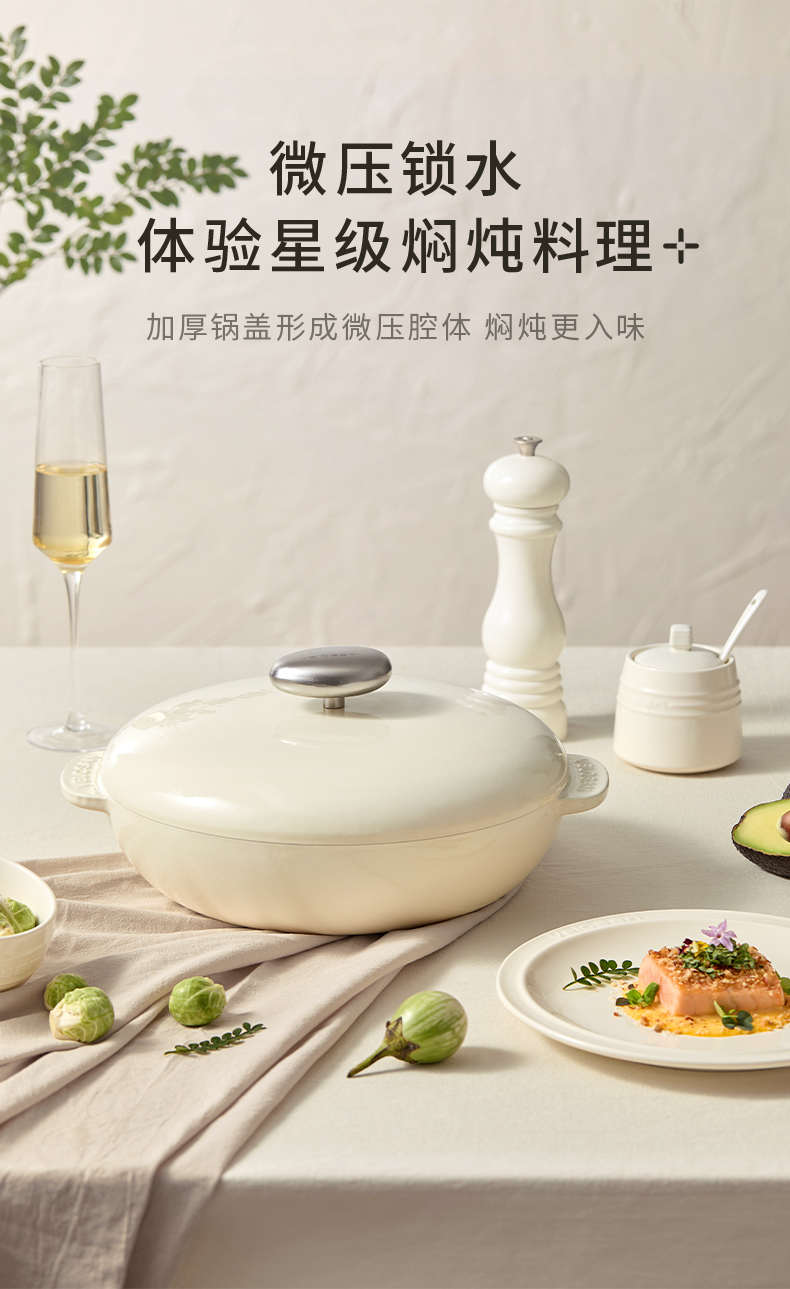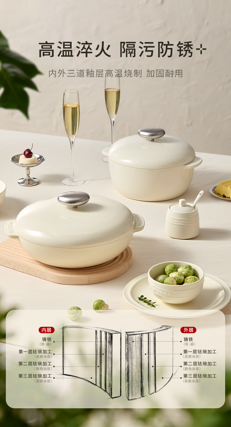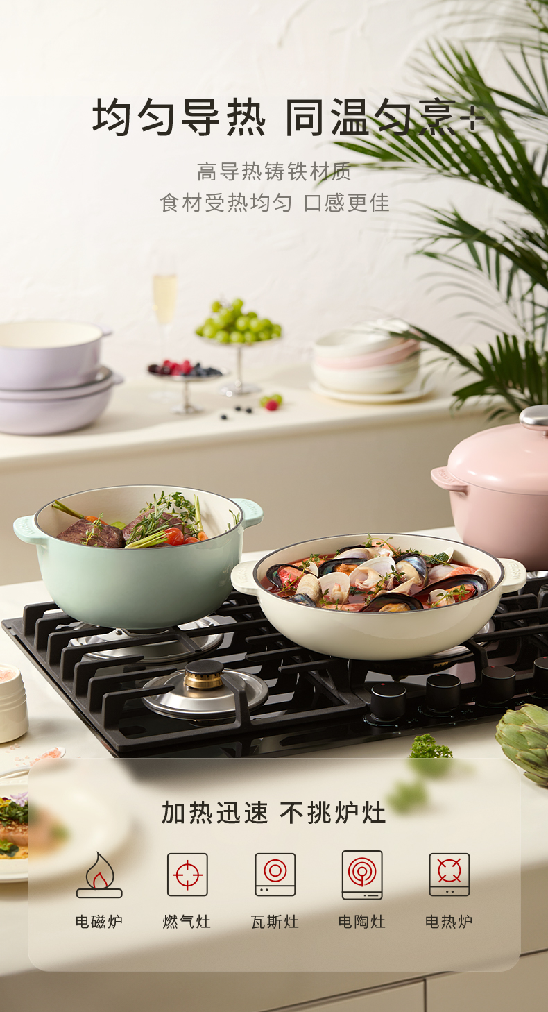 优选珐琅,高颜值,易清洁; 无水烹饪,锁住营养; 水汽自循环,保留鲜味; 均匀导热,聚热环保; 厚实