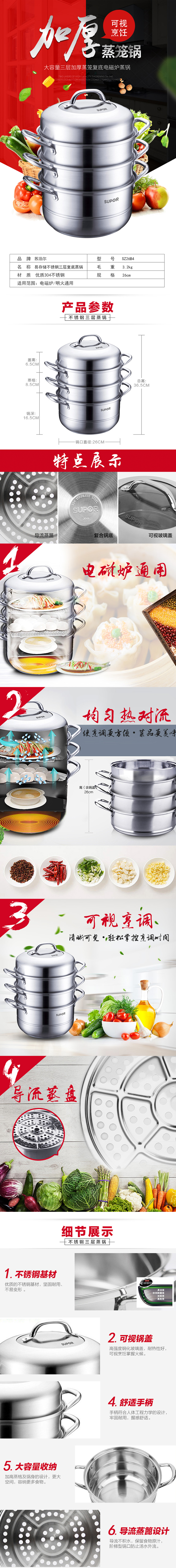 1、优质304系列不锈钢基材,健康耐用,品质生活 2、金属连接手柄,牢固耐用,握感舒适 3、锅身与蒸