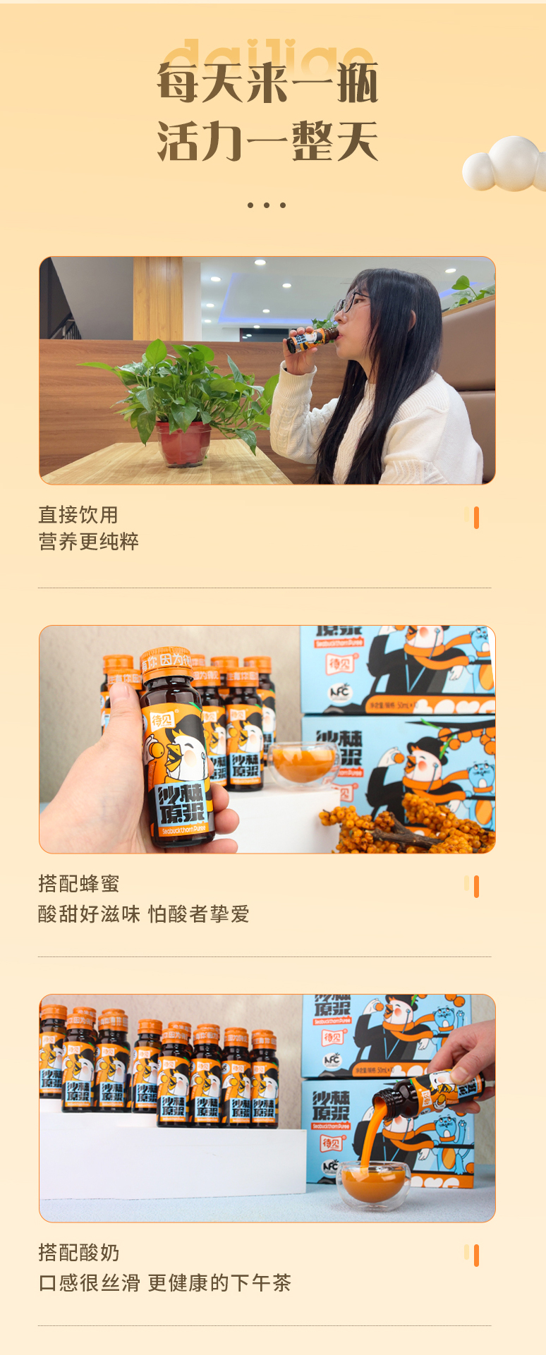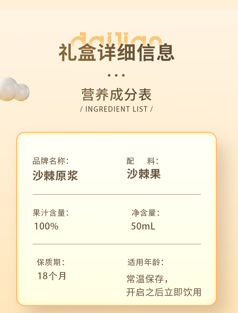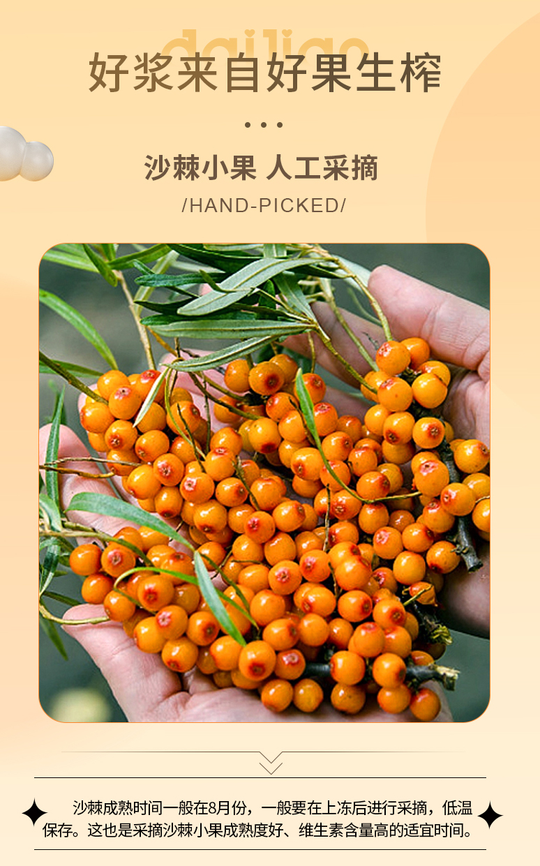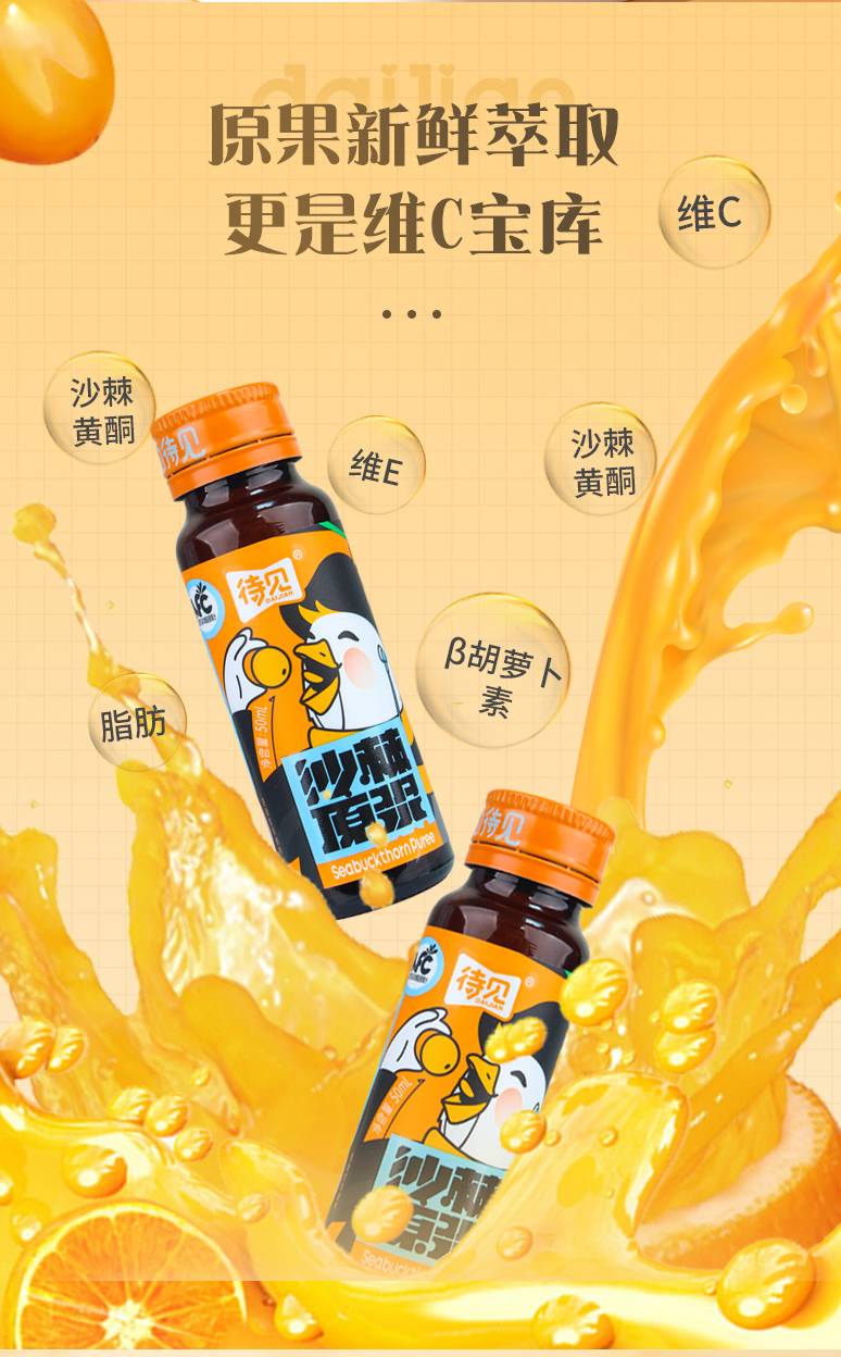 品牌:待见 100%纯沙棘原浆 0添加防腐剂,原果新鲜萃取,满满的维C 直接饮用,营养更纯粹 怕酸人