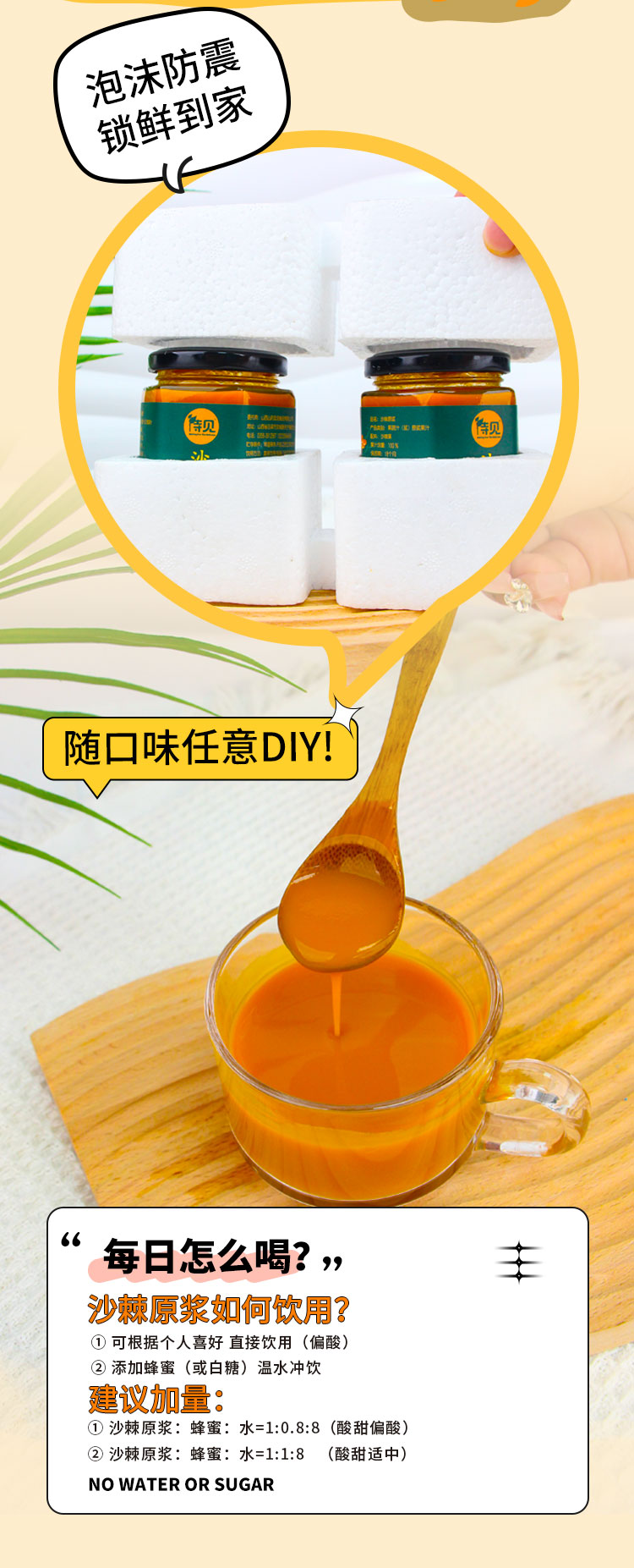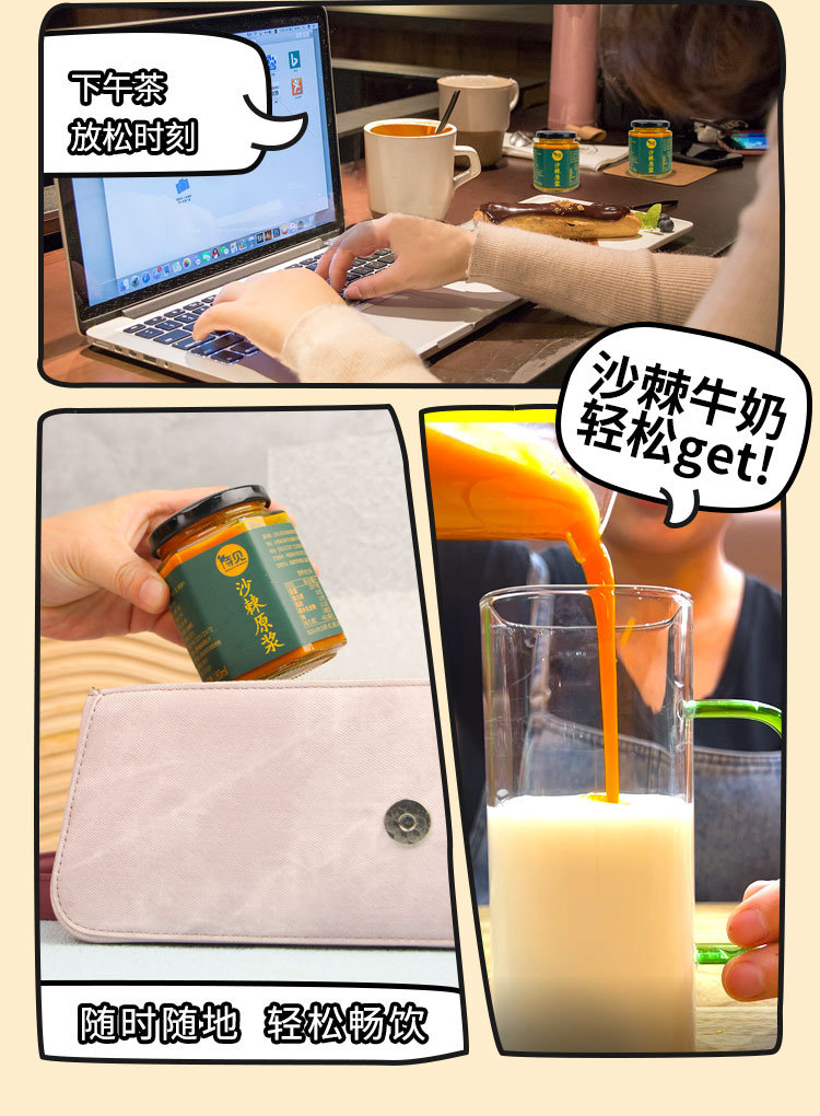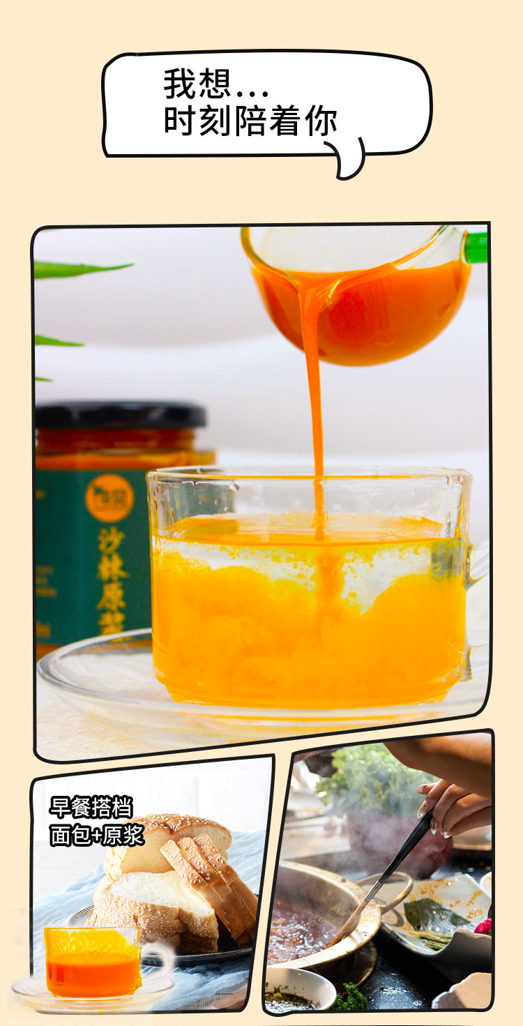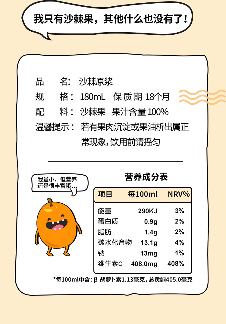 品牌:待见 100%纯沙棘原浆 0添加防腐剂,原果新鲜萃取,满满的维C 直接饮用,营养更纯粹 怕酸人