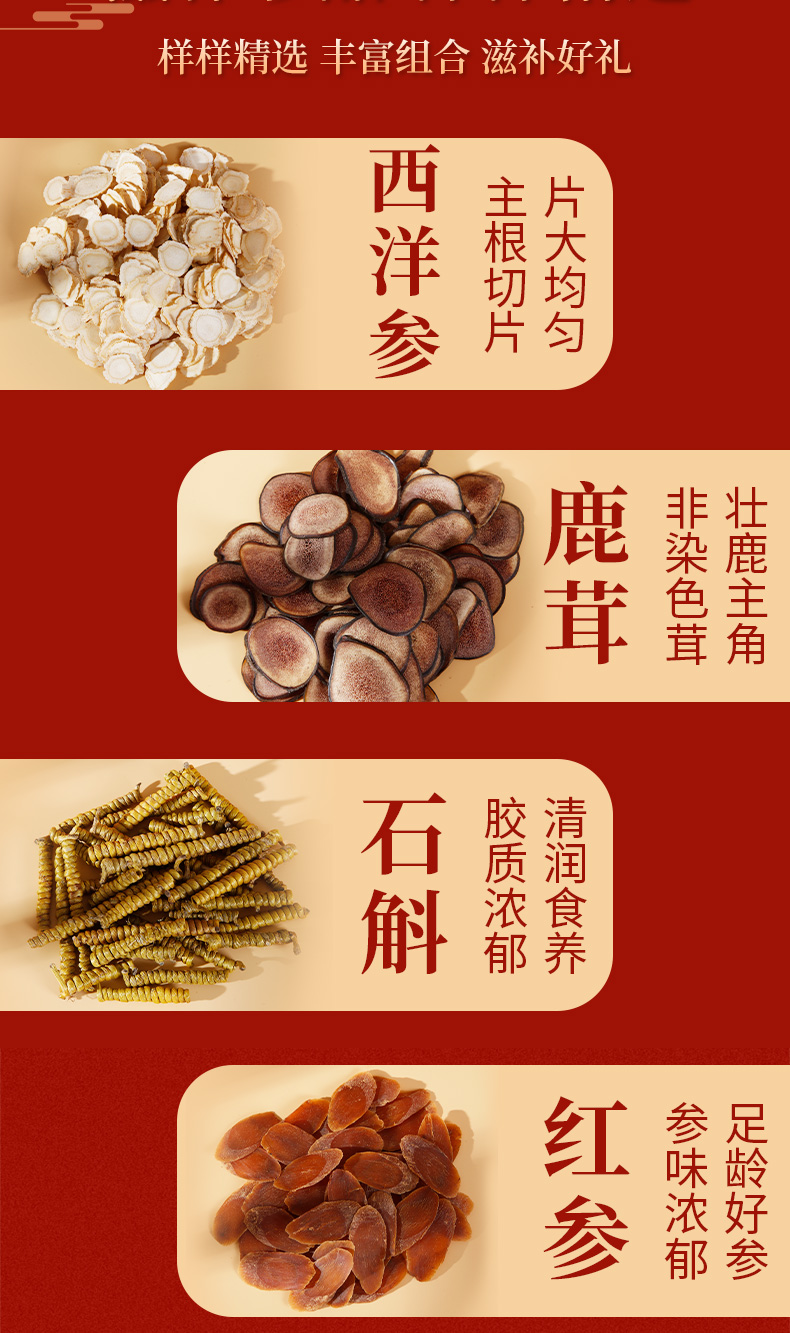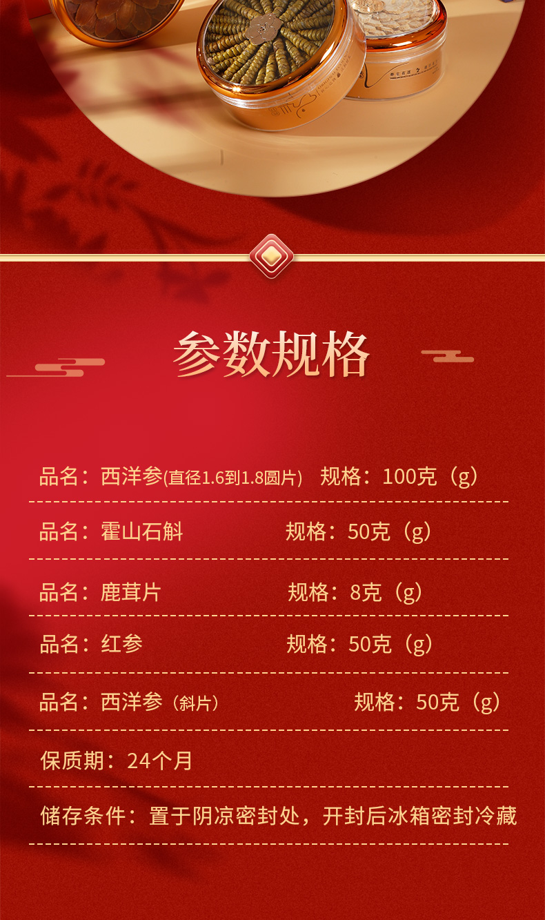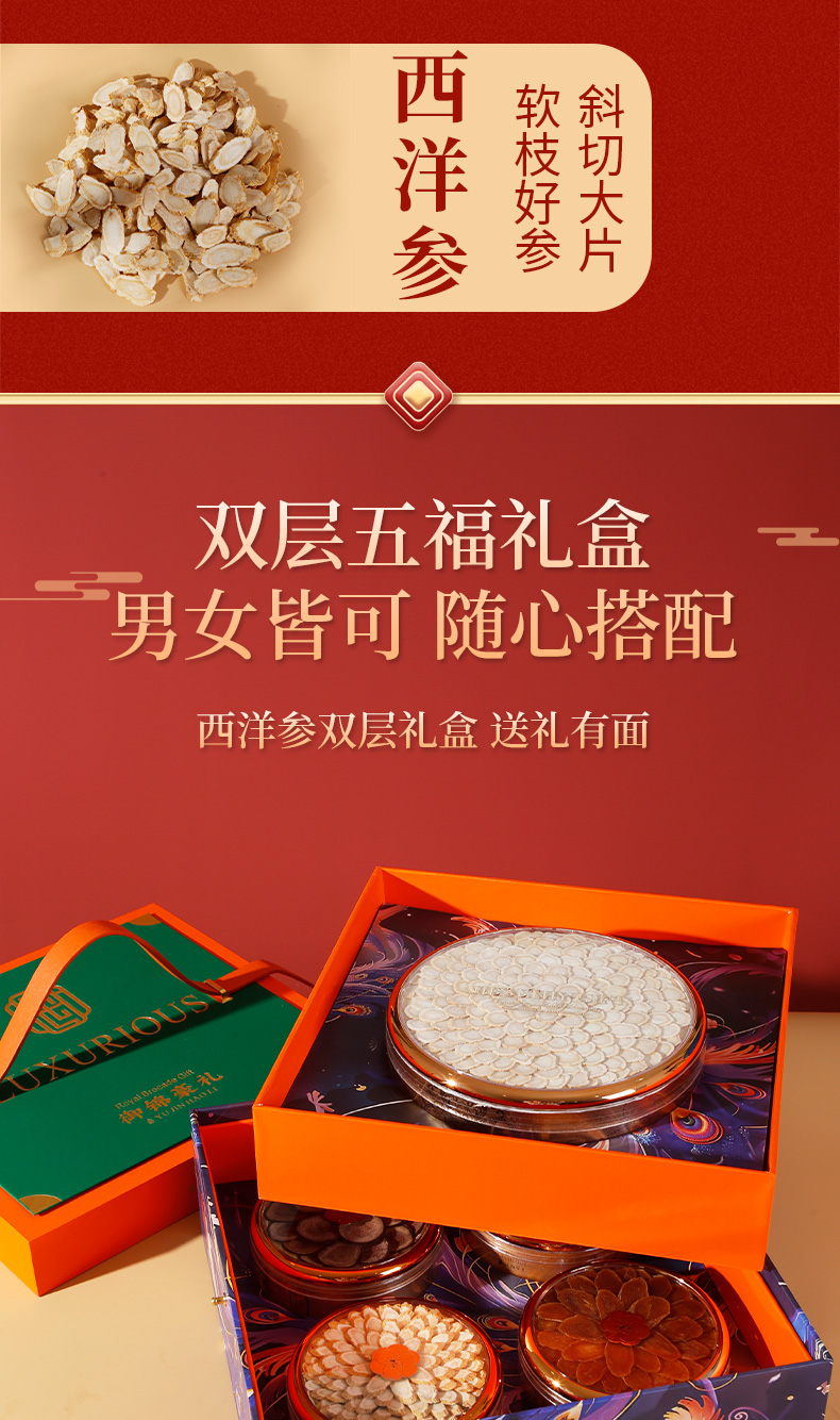 西洋参圆片100克+西洋参斜片50克+霍山石斛(龙头凤尾)50克+红参50克+鹿茸8克 精美五福礼