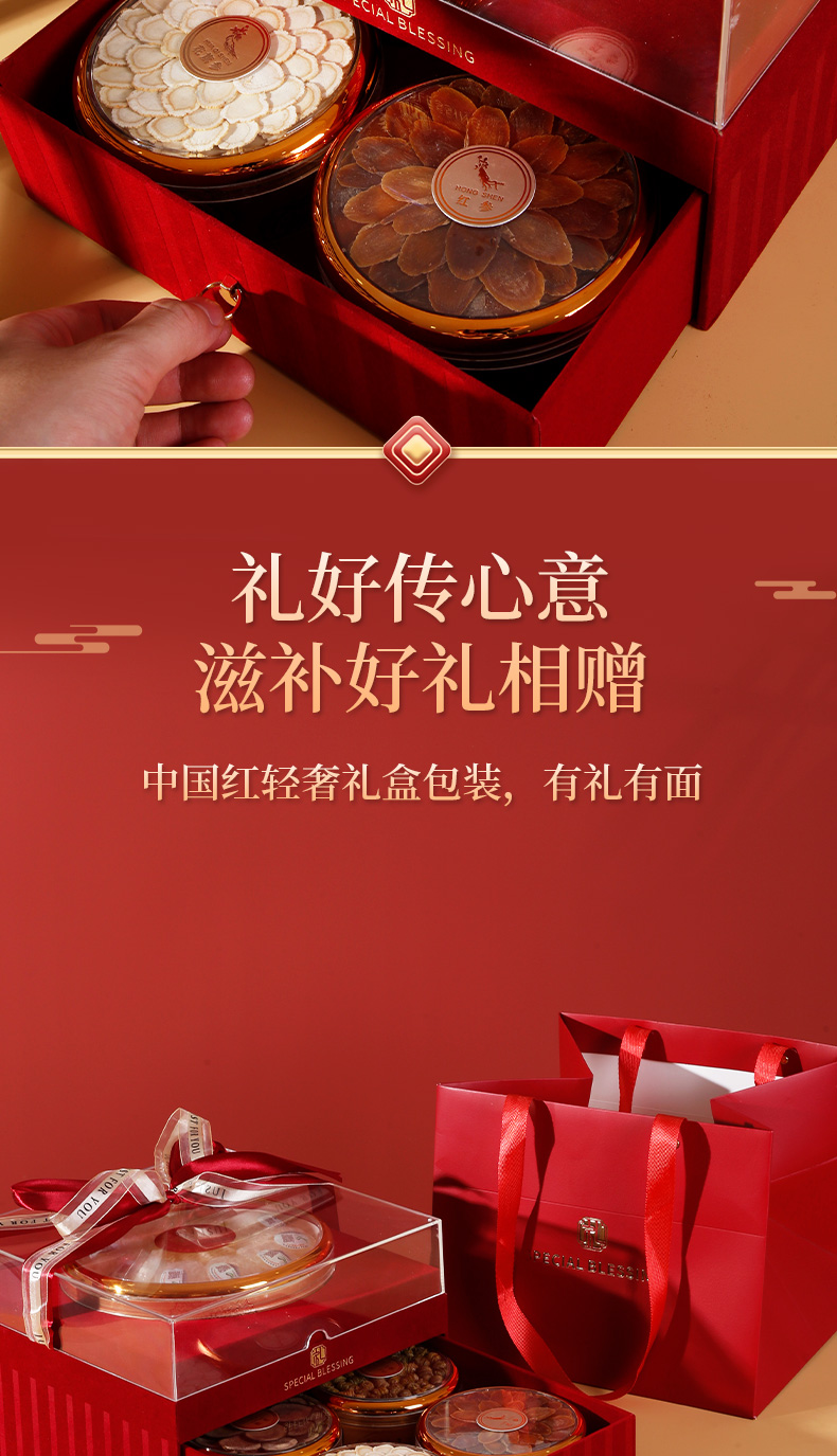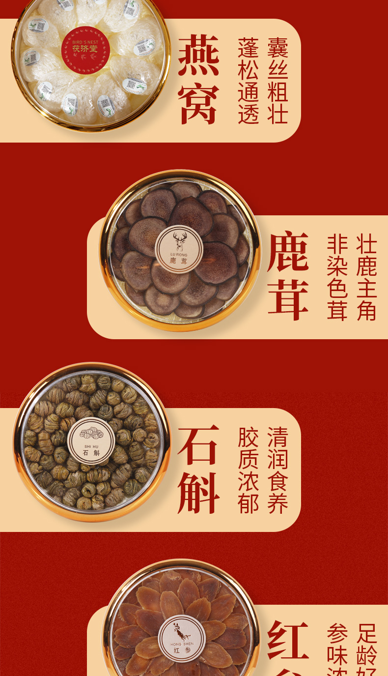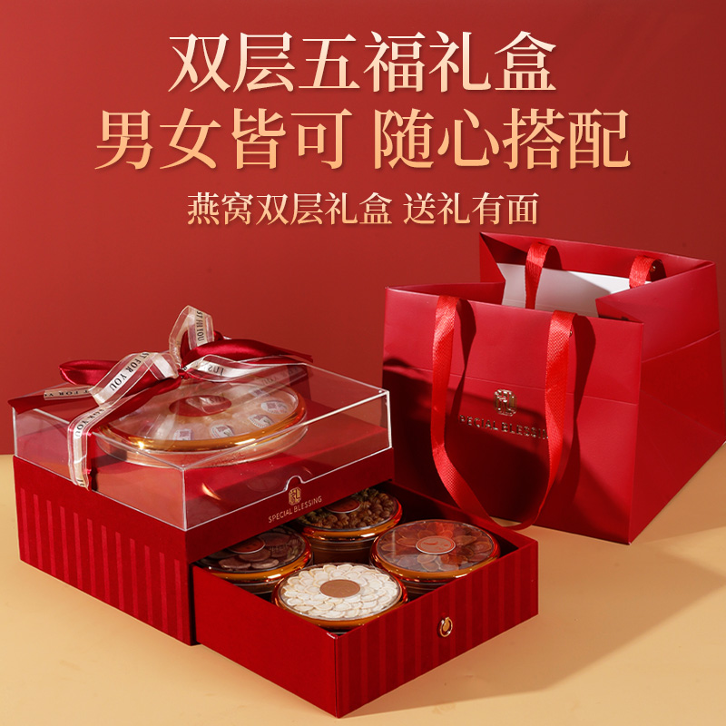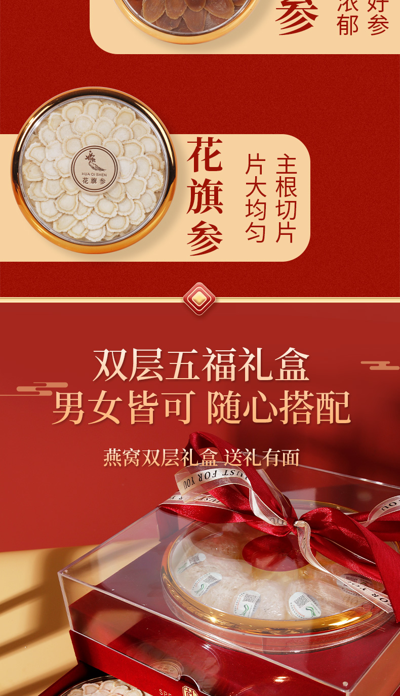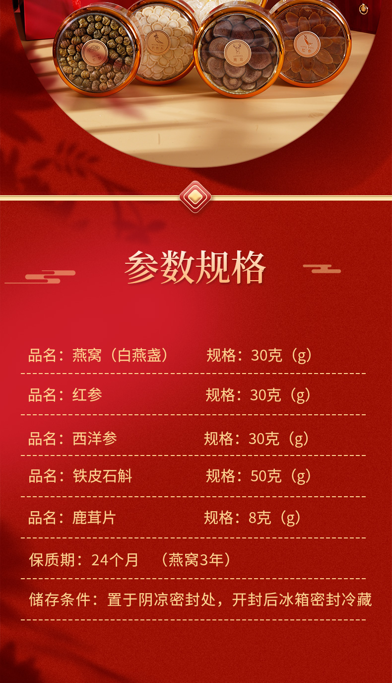 印尼进口燕窝30克+红参30克+西洋参大片30克+石斛50克+鹿茸片8克,精美水晶丝绒五福礼盒,双层