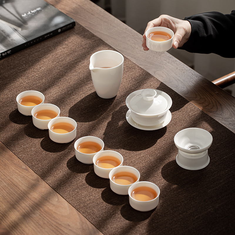羊脂玉茶具套装,质地细腻温润,色泽如脂,透光性佳。每件茶具均独一无二,兼具美观与实用。使用羊脂玉茶具