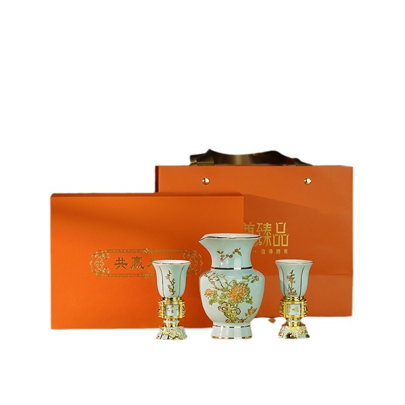 作品源自于经典梅瓶造型,将梅瓶造型一分为四,一壶、一罐、两杯。器型表面以银杏叶作为点缀辅以万寿金纹, -