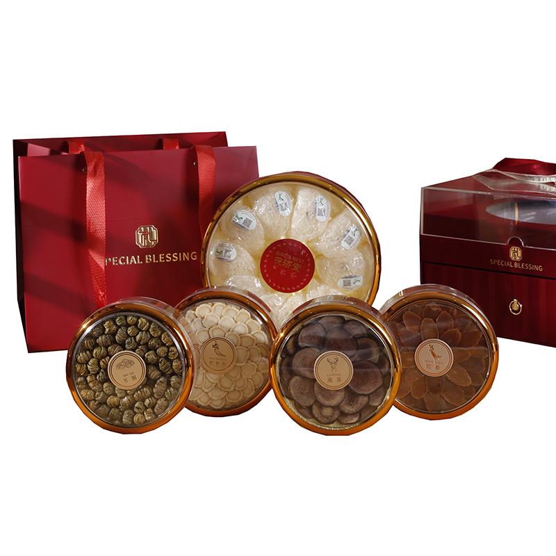 印尼进口燕窝30克+红参30克+西洋参大片30克+石斛50克+鹿茸片8克,精美水晶丝绒五福礼盒,双层 -